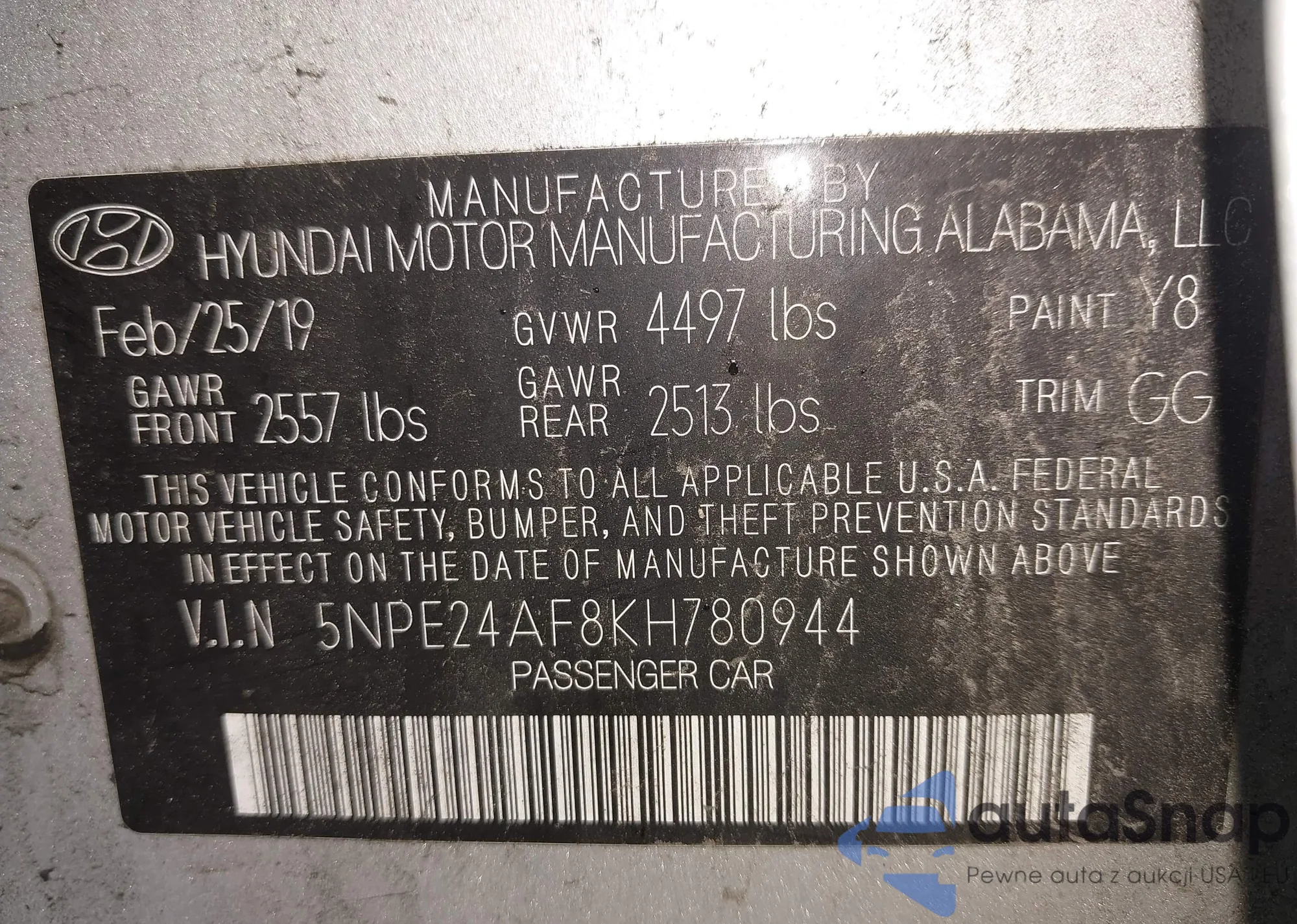 LOT: 42513660 VIN: 5NPE24AF8KH780944