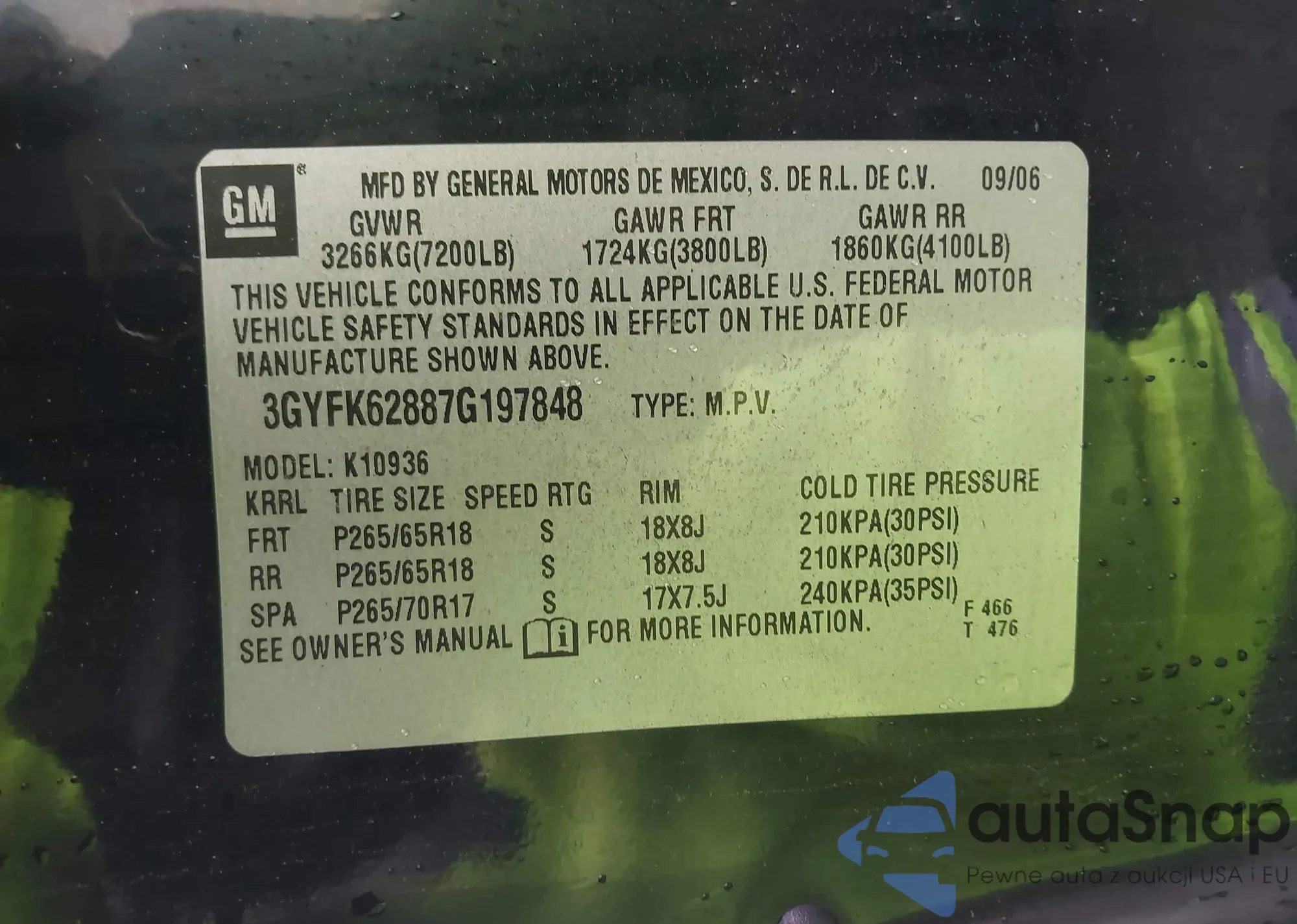 LOT: 42100948 VIN: 3GYFK62887G197848
