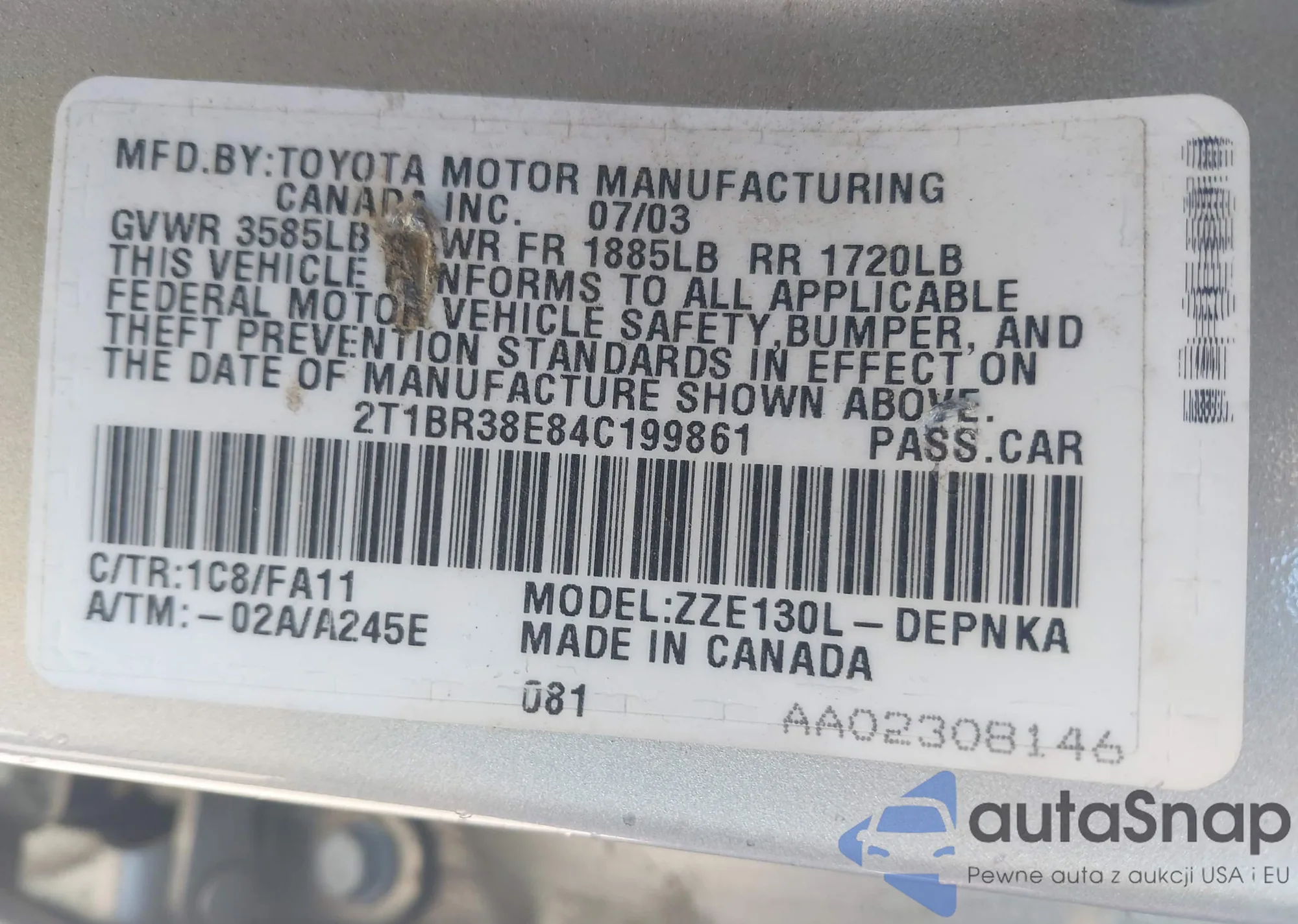 • VIN 2T1BR38E84C199861