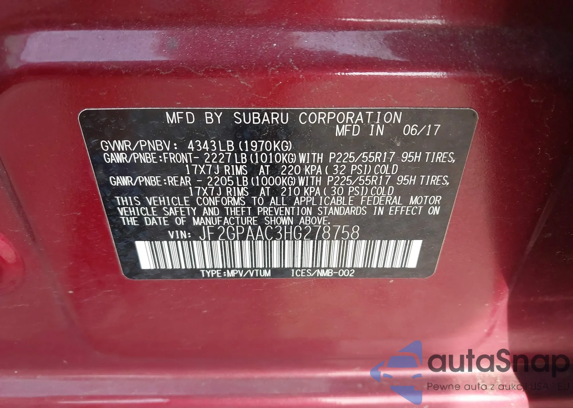 LOT: 43091528 VIN: JF2GPAAC3HG278758