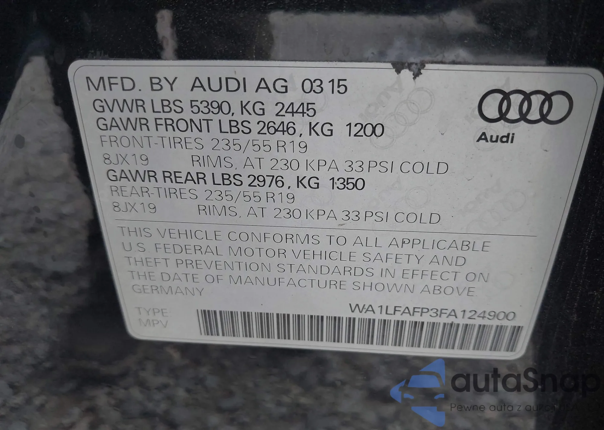 LOT: 43106941 VIN: WA1LFAFP3FA124900