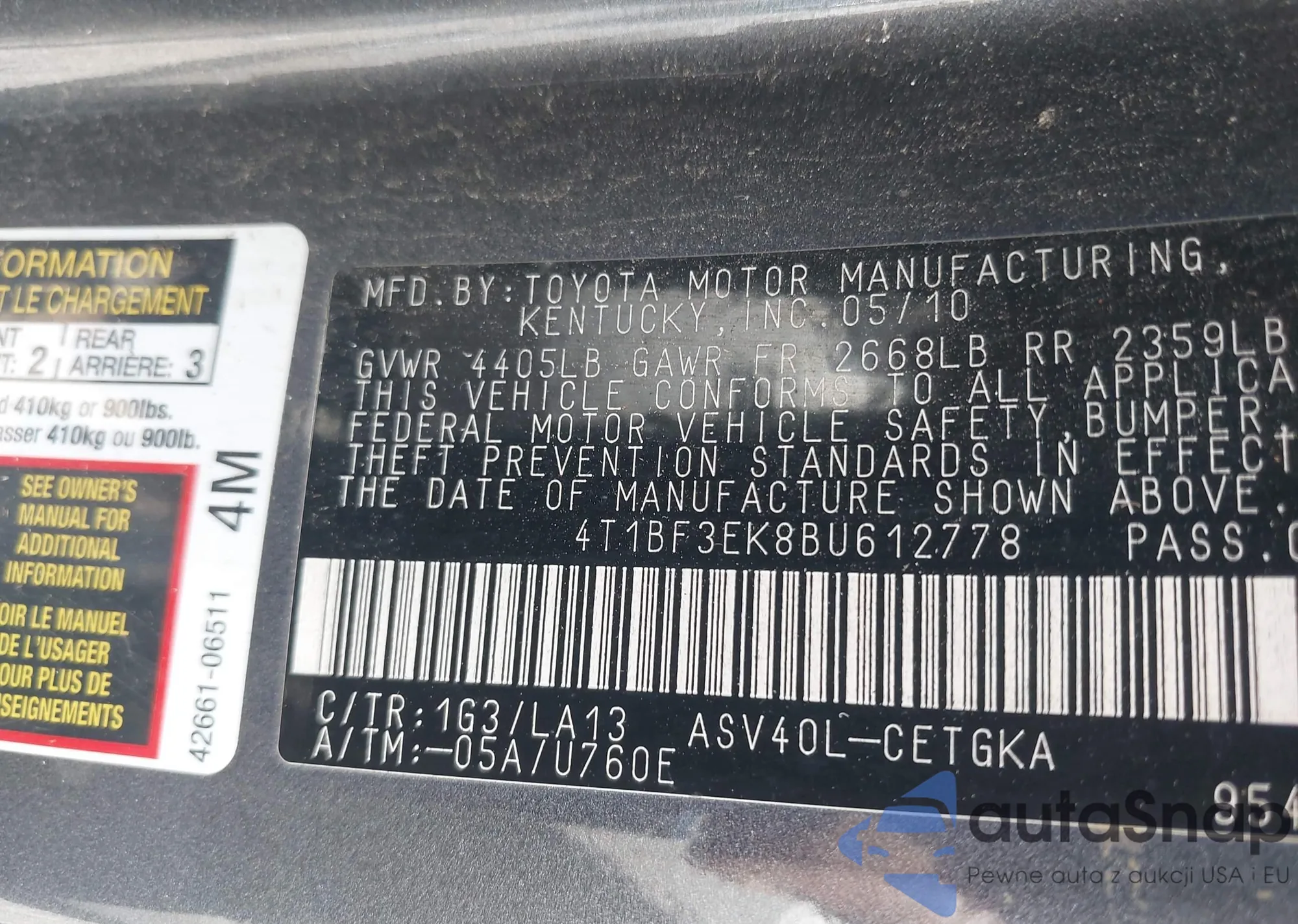 • VIN 4T1BF3EK8BU612778