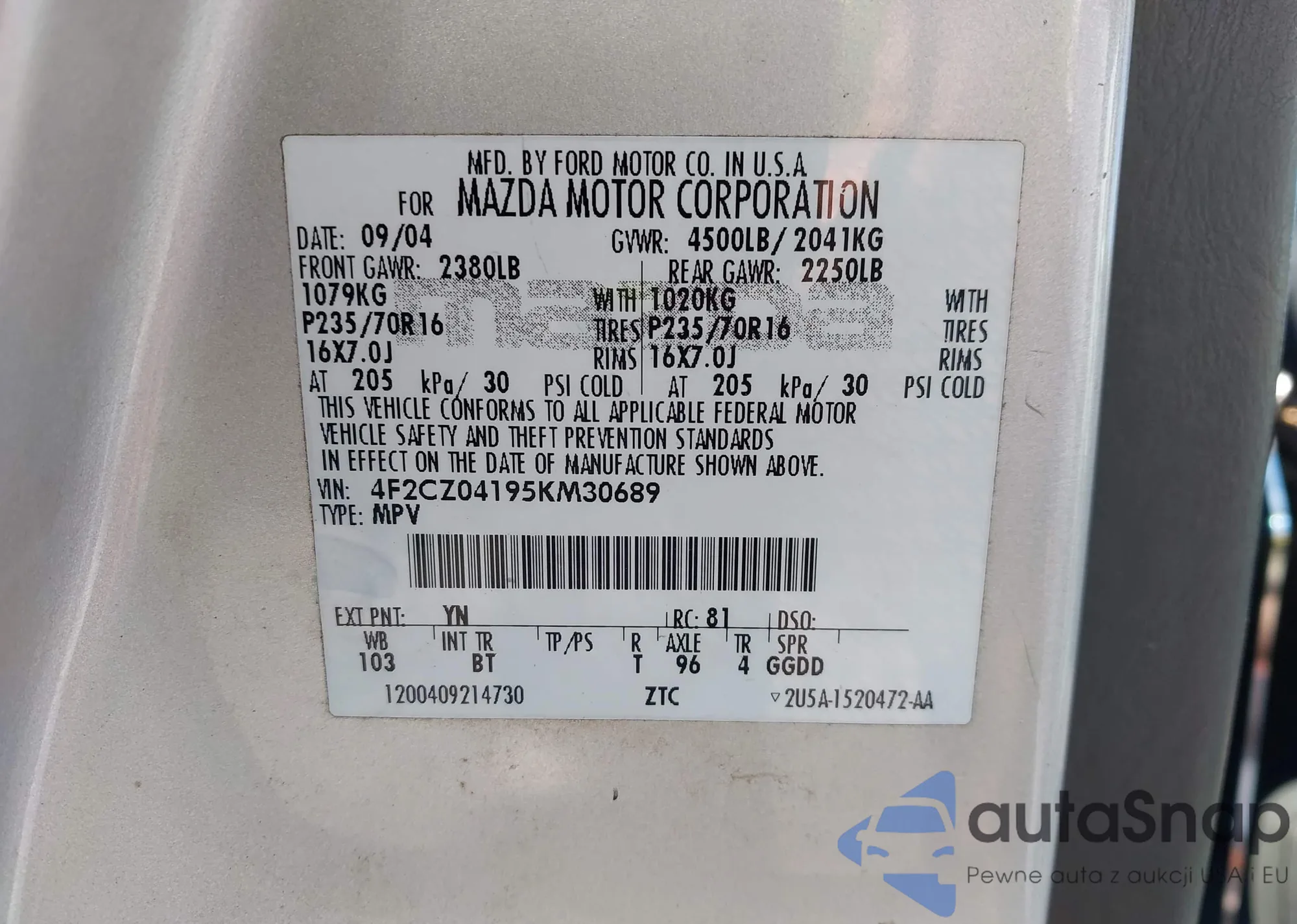 • VIN 4F2CZ04195KM30689
