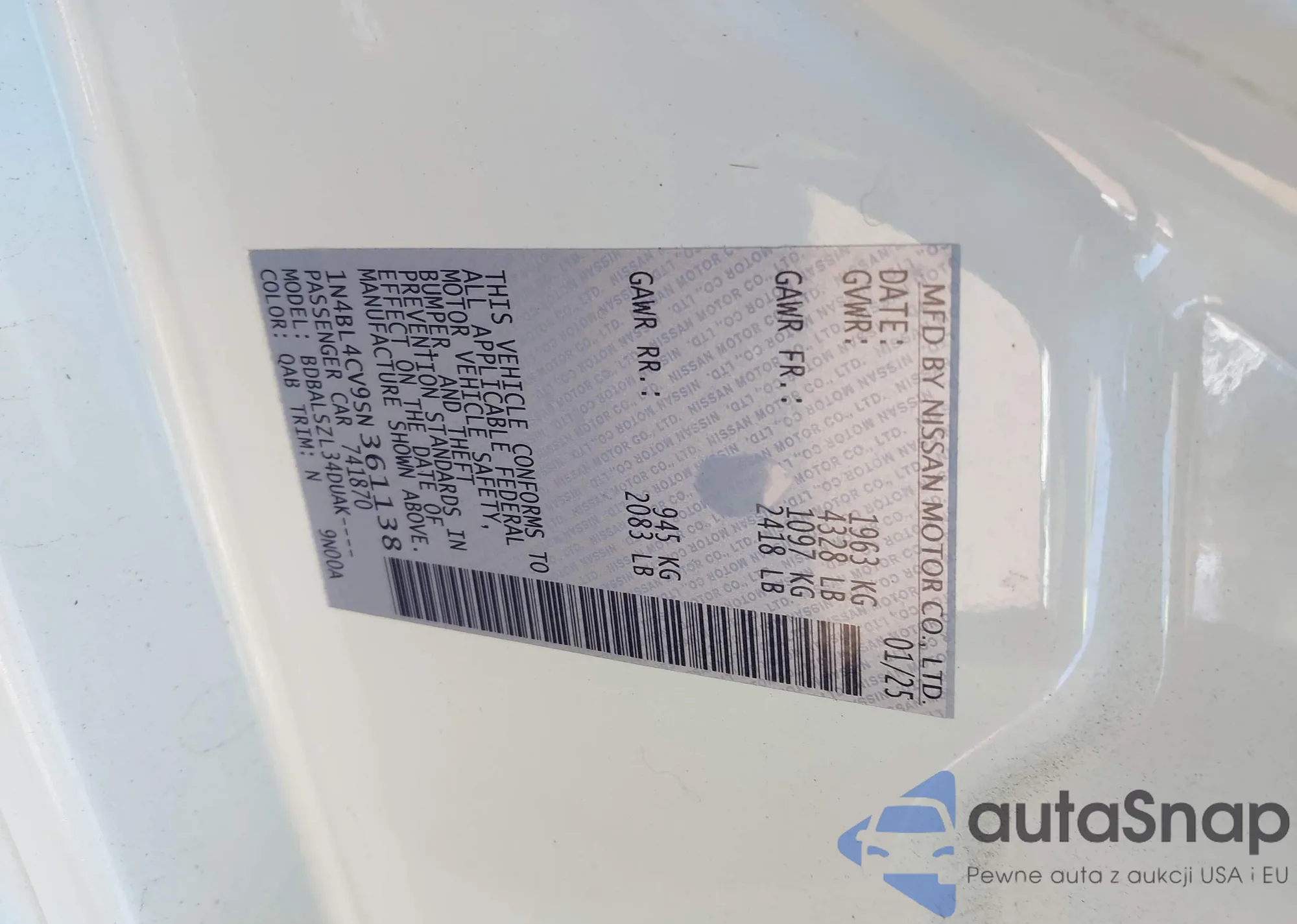 LOT: 43142567 VIN: 1N4BL4CV9SN361138