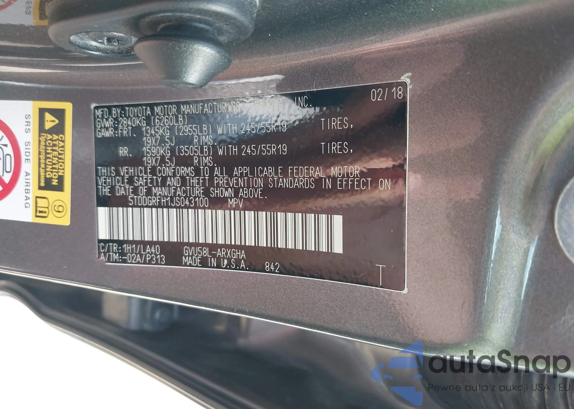 LOT: 42431767 VIN: 5TDDGRFH1JS043100