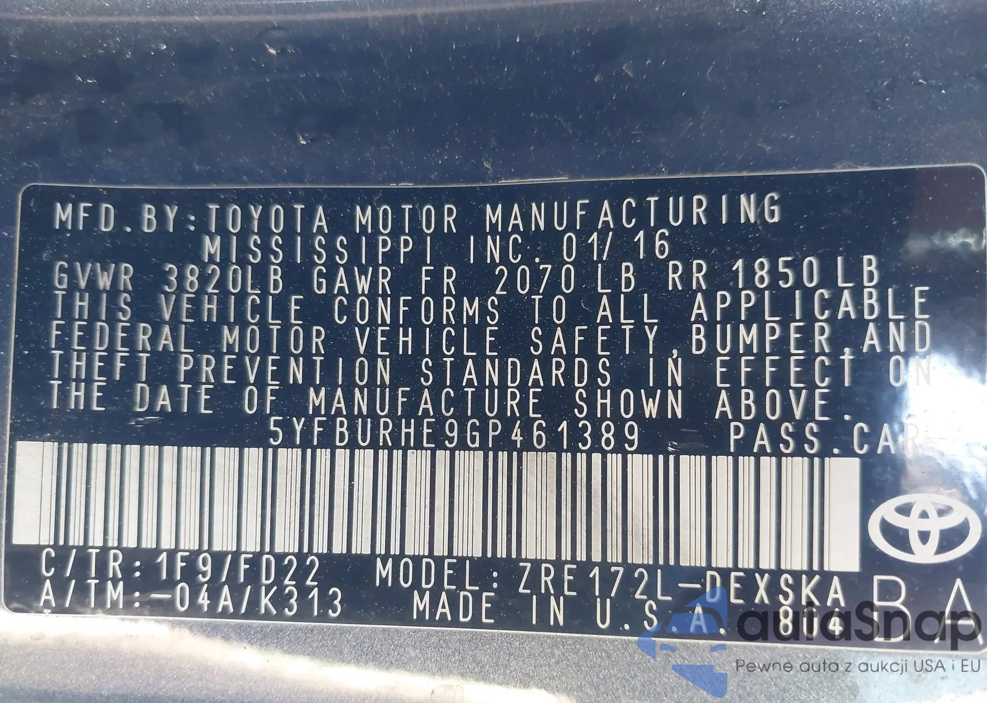 • VIN 5YFBURHE9GP461389