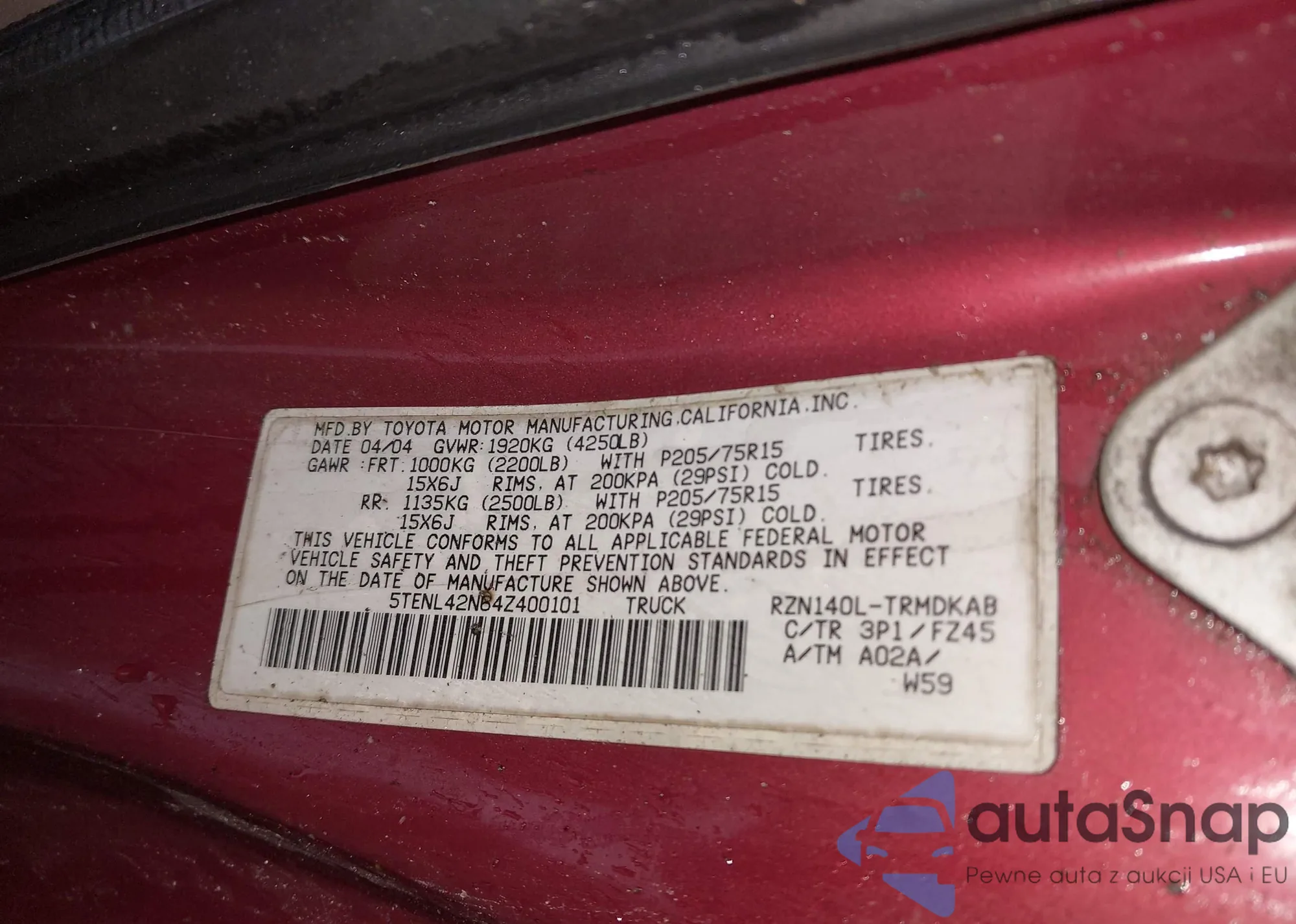 2004 Toyota Tacoma z USA, uszkodzony, nr VIN 5TENL42N64Z400101
