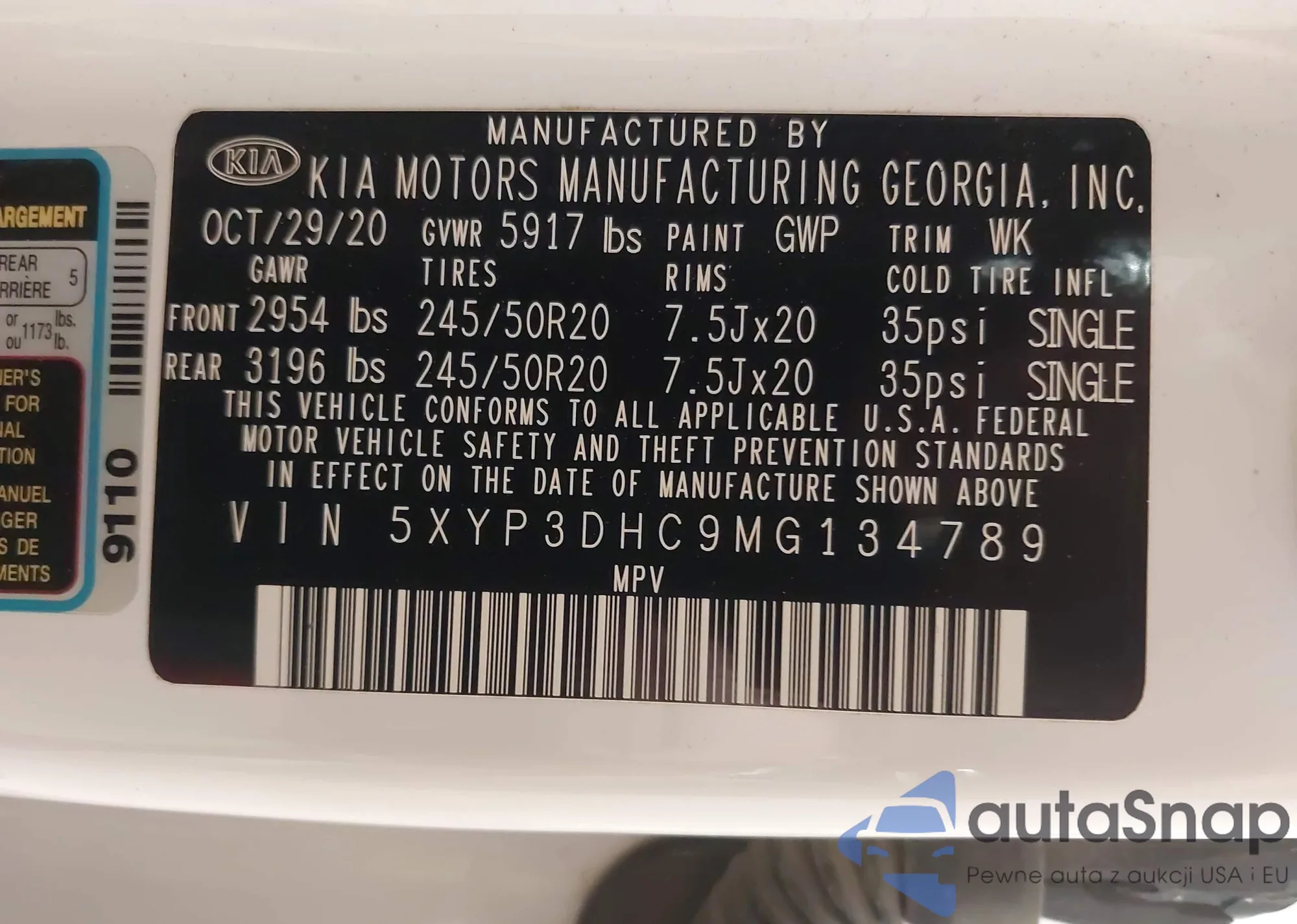 • VIN 5XYP3DHC9MG134789