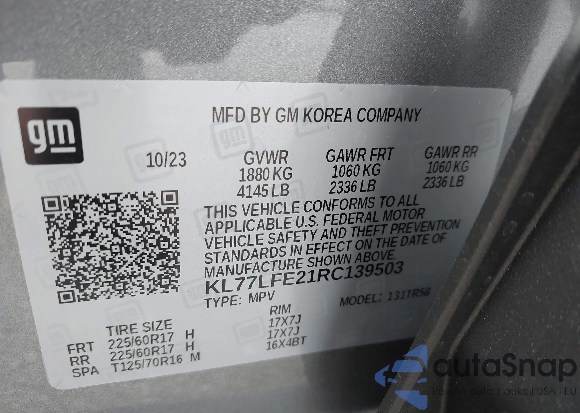 • VIN KL77LFE21RC139503