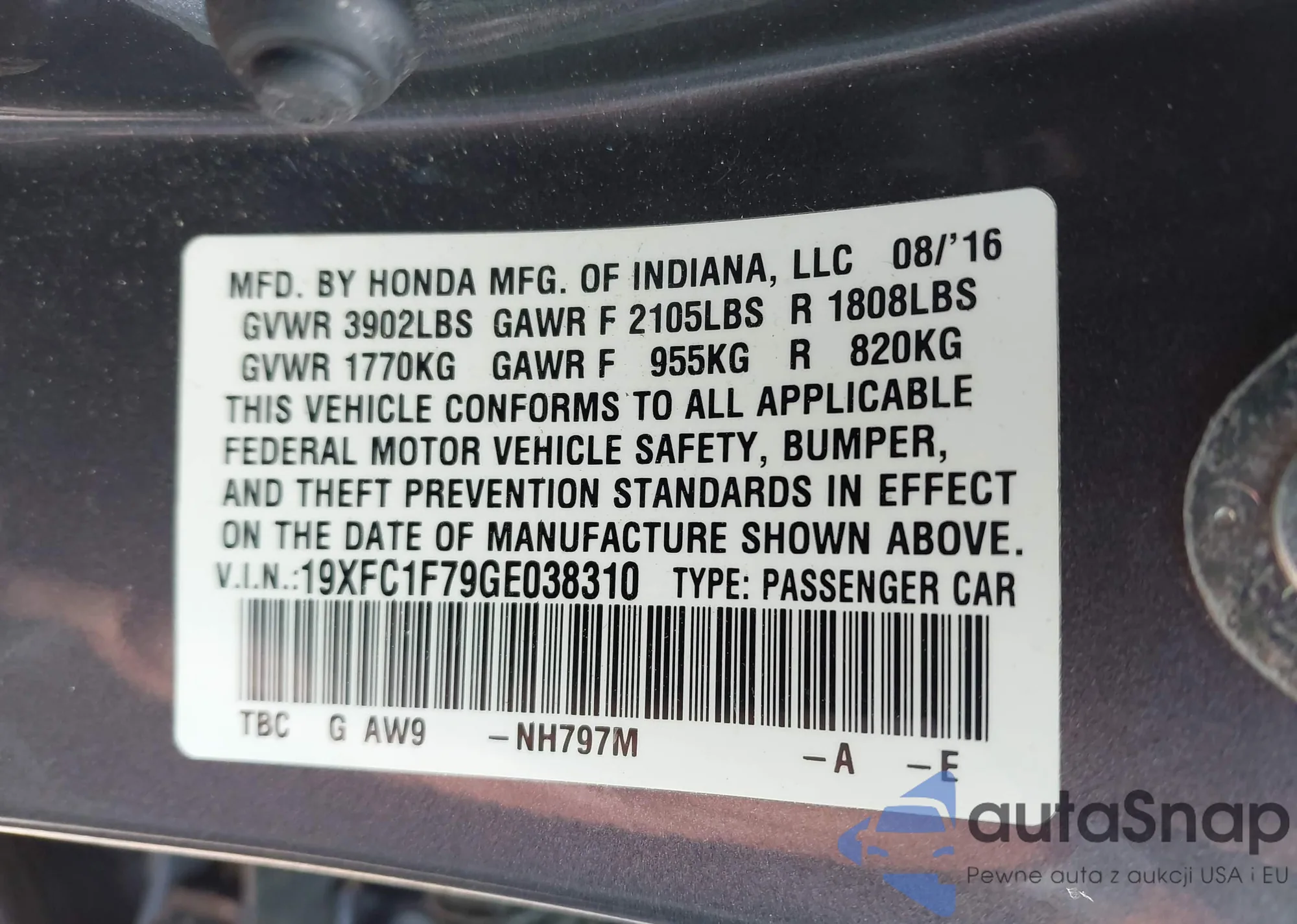 • VIN 19XFC1F79GE038310