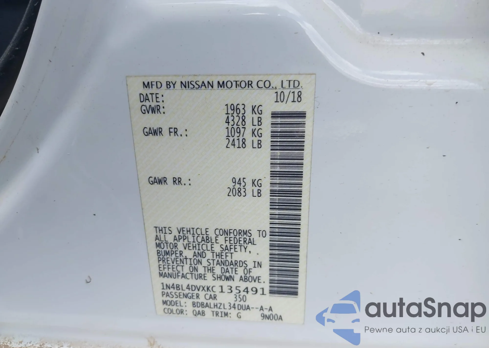 • VIN 1N4BL4DVXKC135491