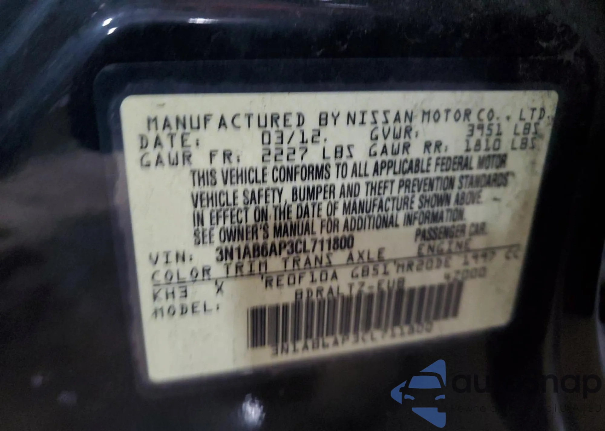 LOT: 70420175 VIN: 3N1AB6AP3CL711800