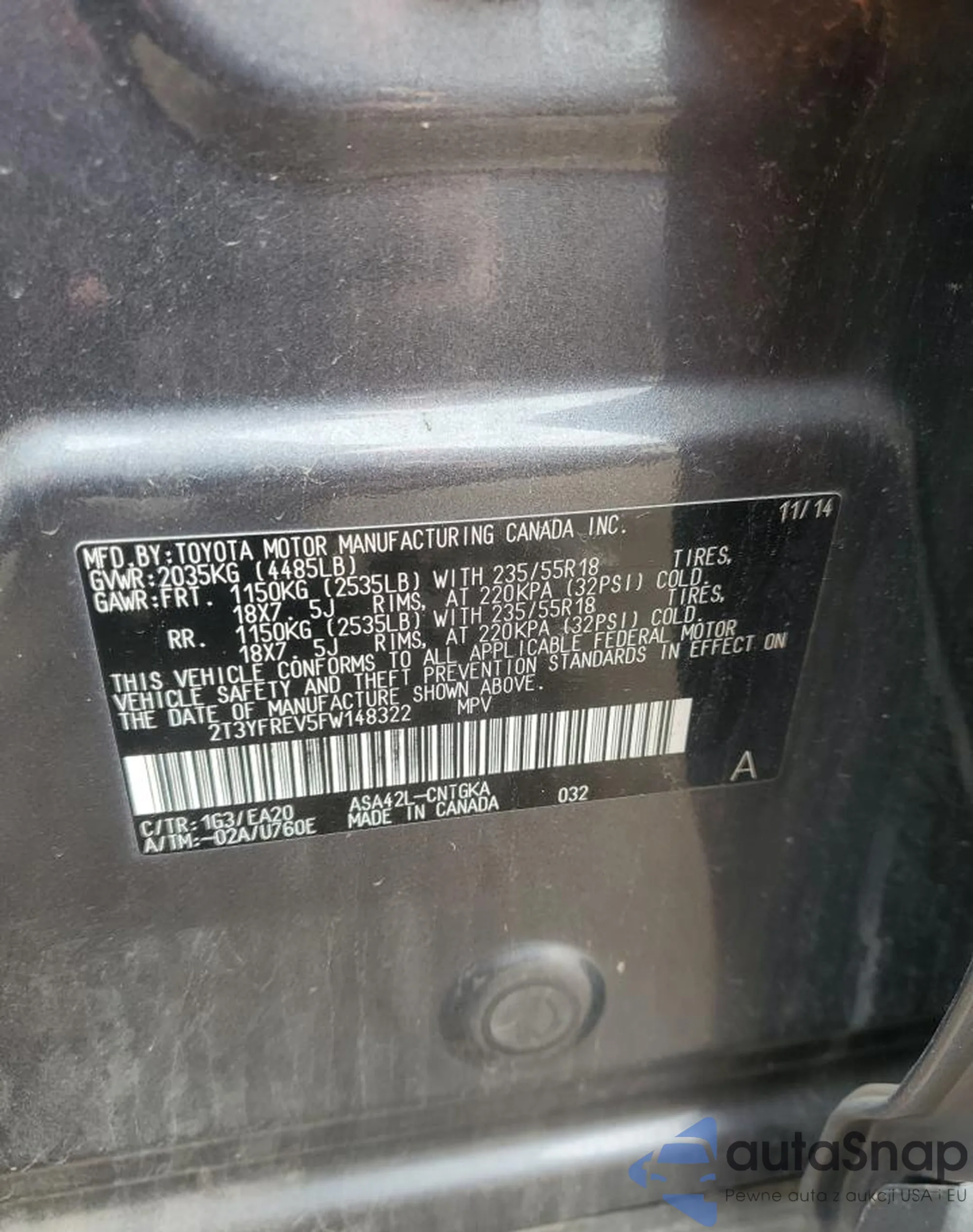 LOT: 71820895 VIN: 2T3YFREV5FW148322