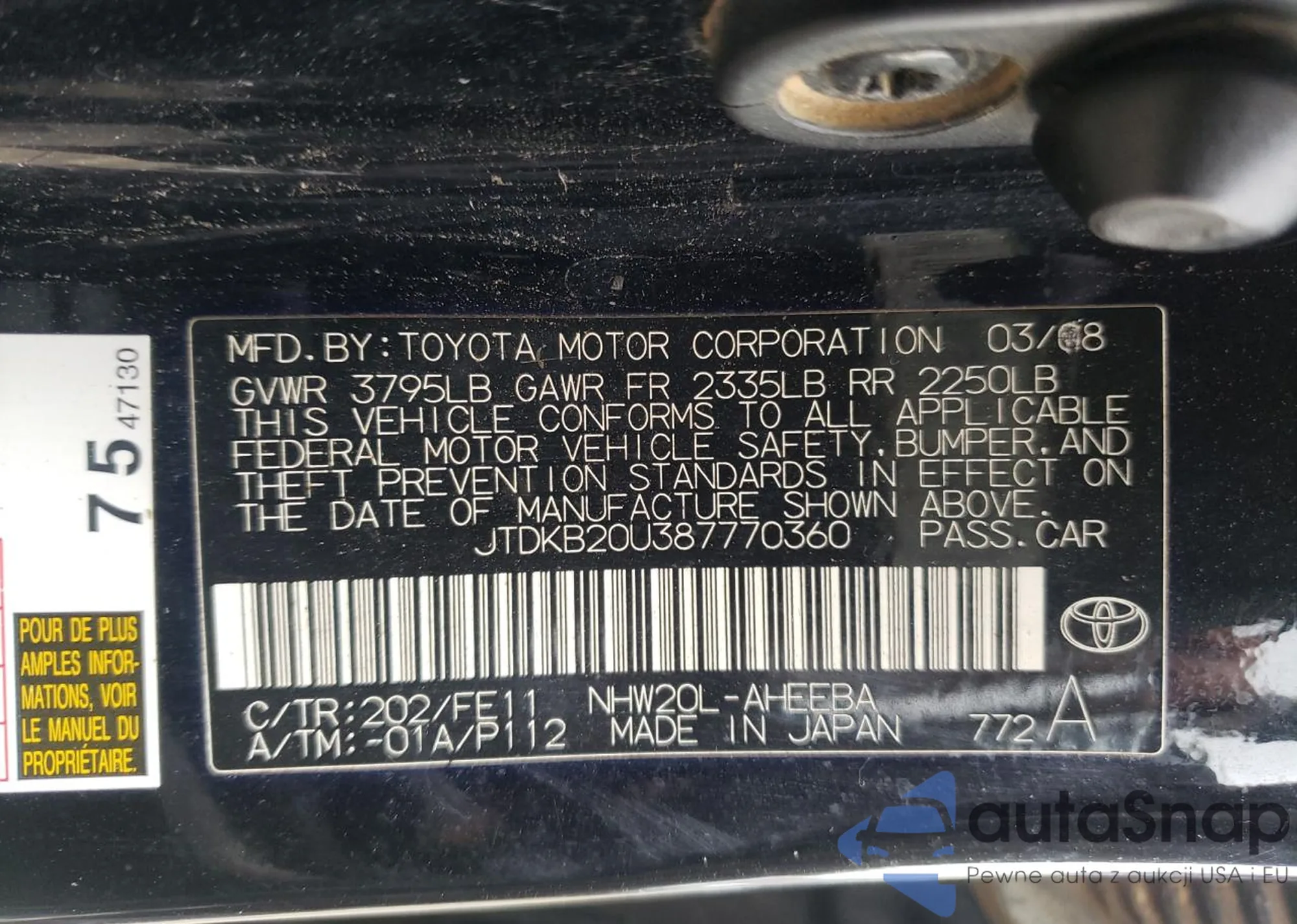 LOT: 68879221 VIN: JTDKB20U387770360