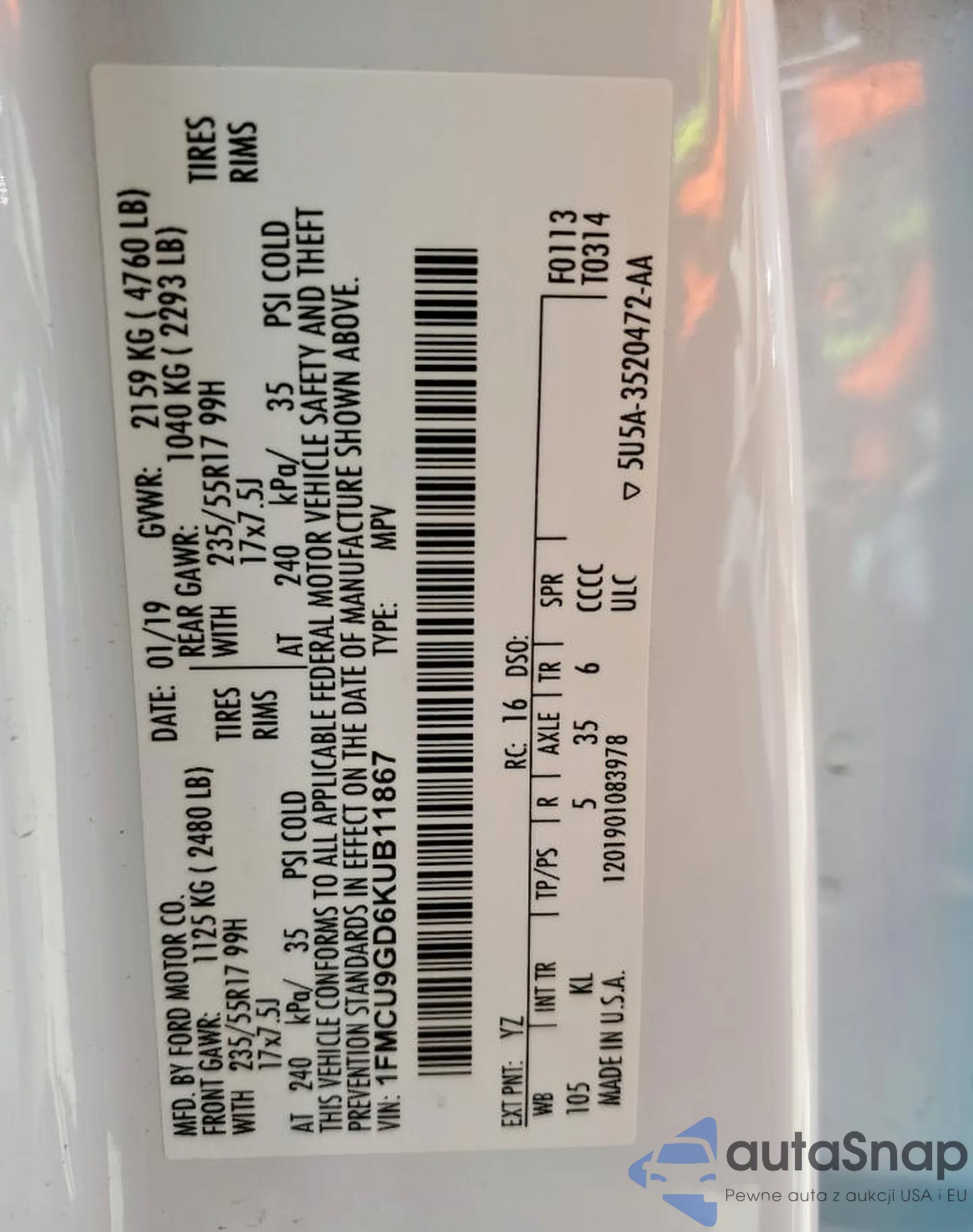 • VIN 1FMCU9GD6KUB11867