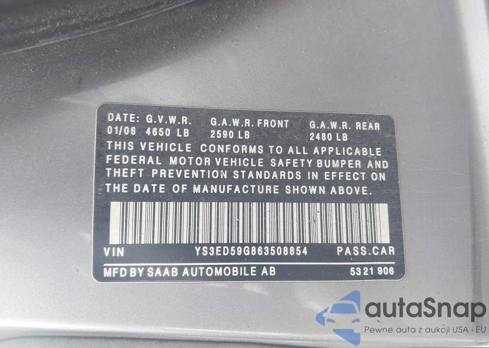 LOT: 43018719 VIN: YS3ED59G863508854