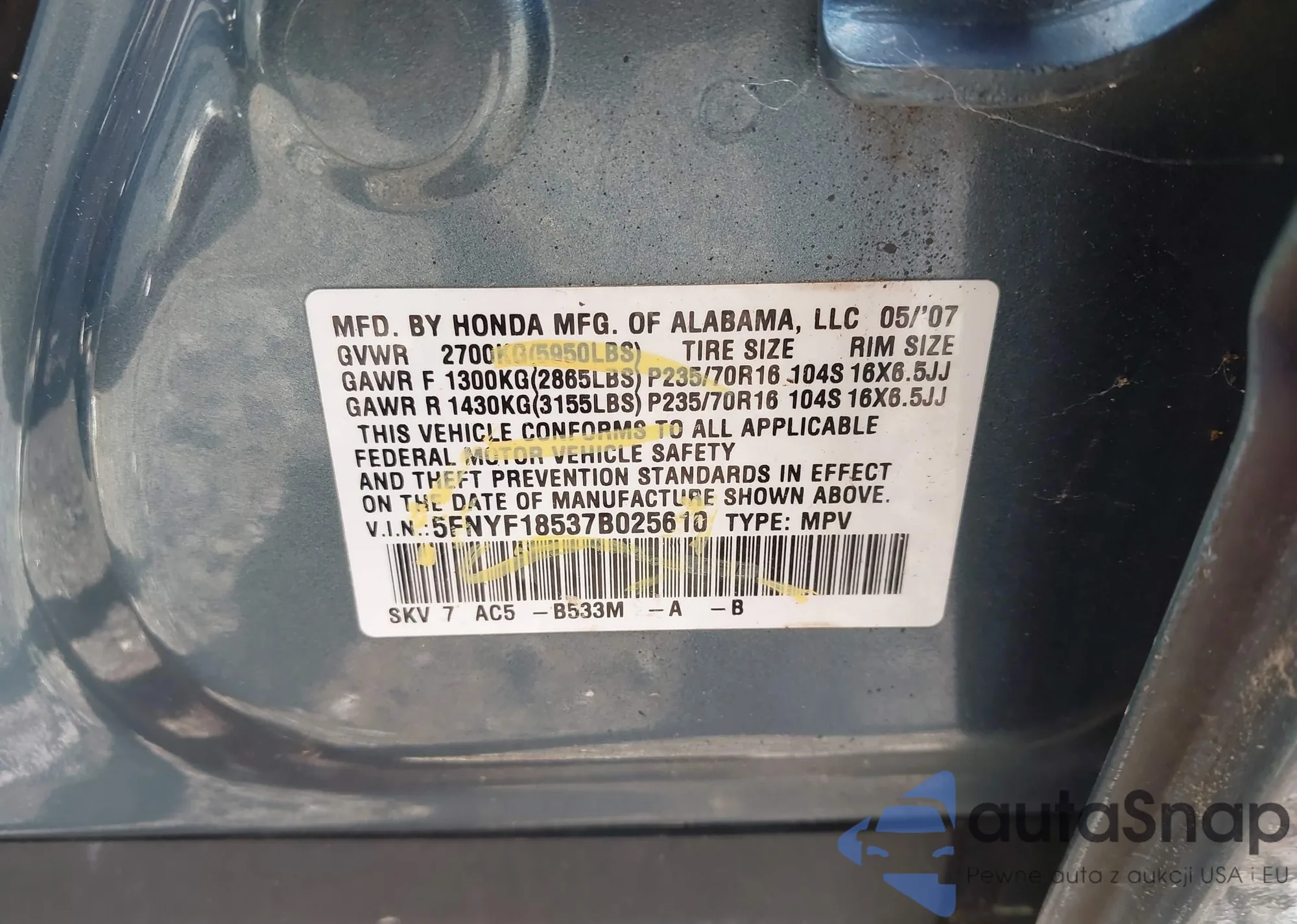 LOT: 43109933 VIN: 5FNYF28156B004291