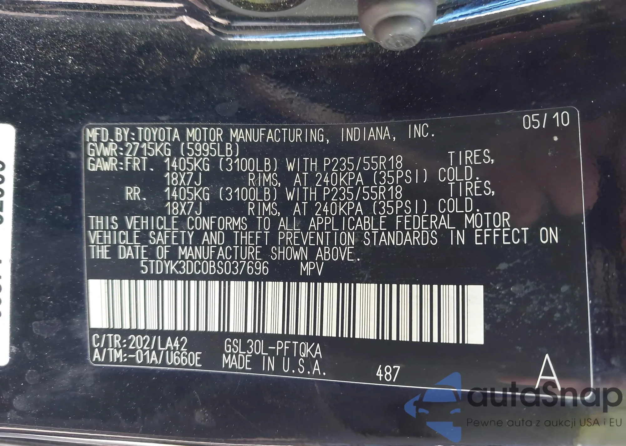 • VIN 5TDYK3DC0BS037696