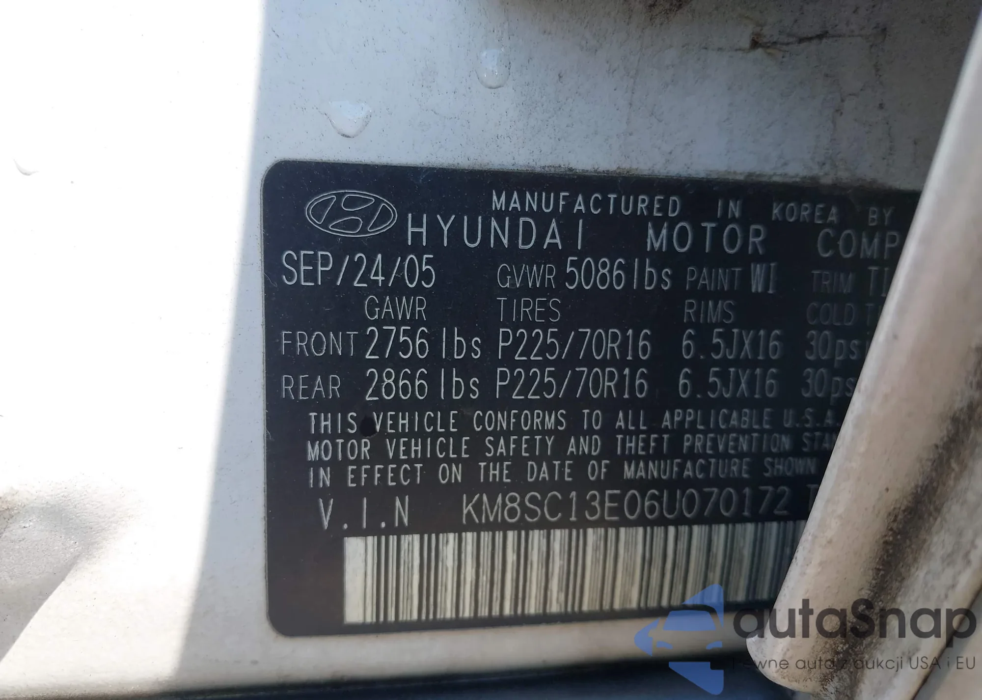 LOT: 43013893 VIN: KM8SC13E06U070172