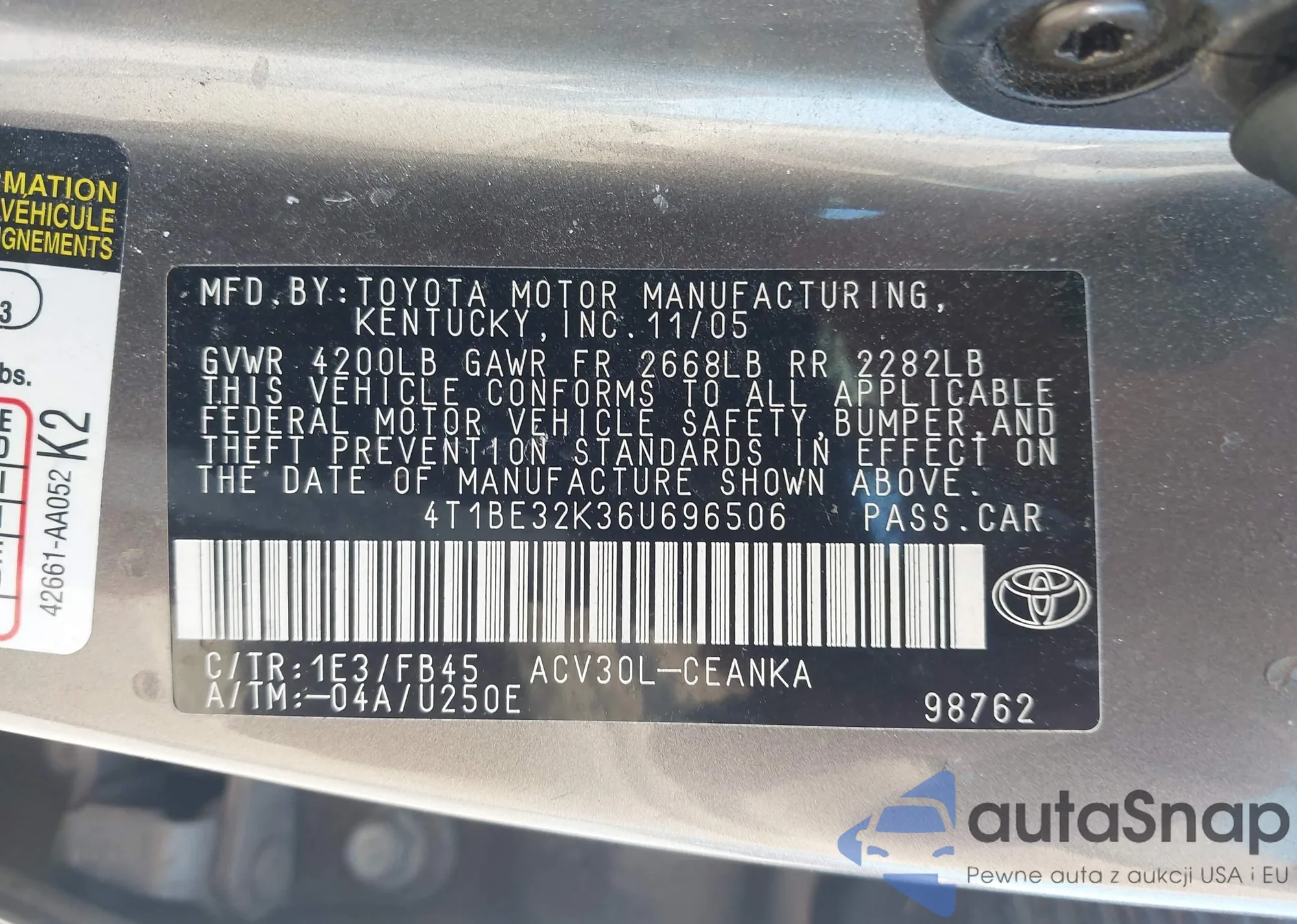• VIN 4T1BE32K36U696506