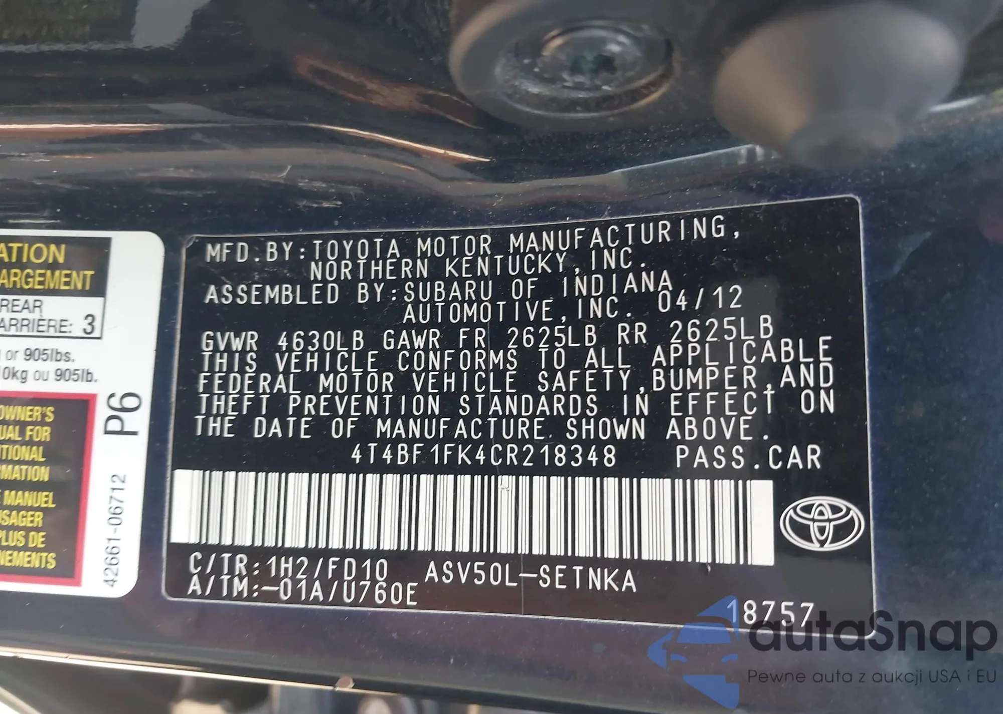 • VIN 4T4BF1FK4CR218348