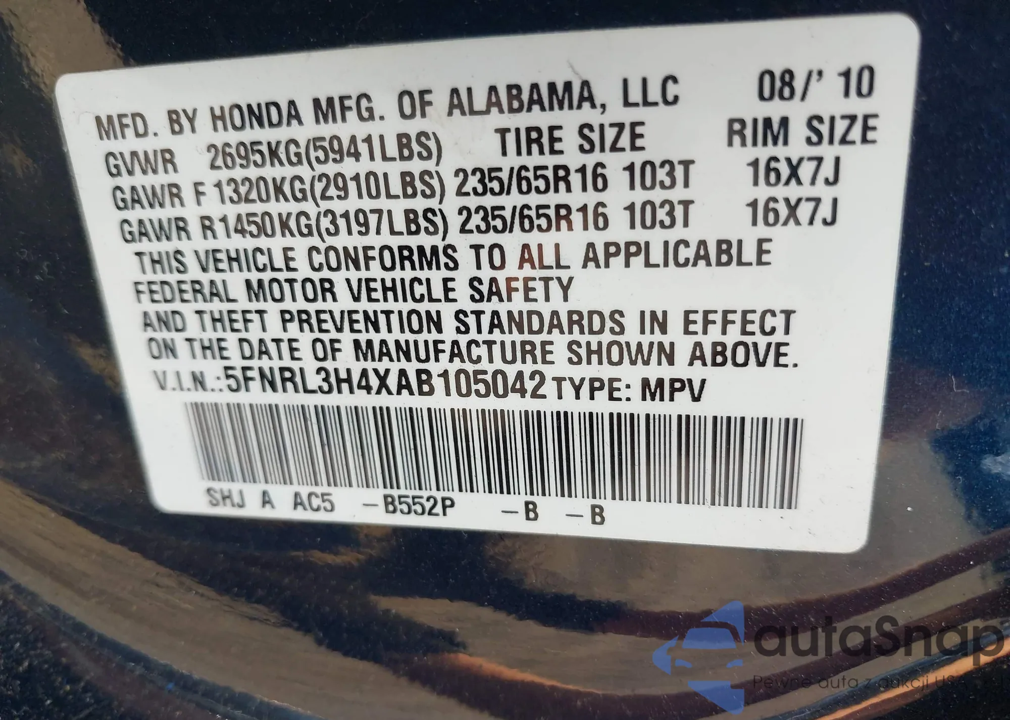 • VIN 5TDZK3EHXCS058958