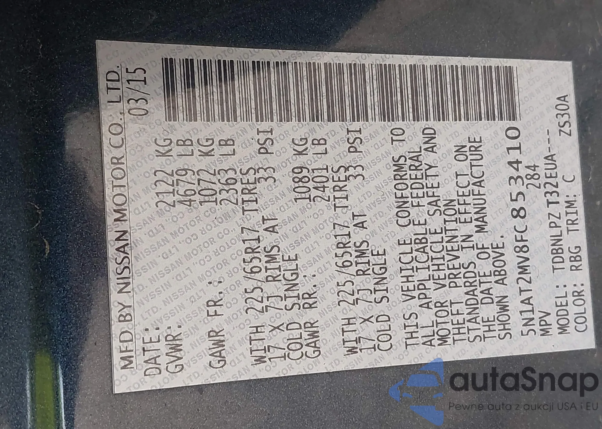LOT: 42918997 VIN: 5N1AT2MV8FC853410