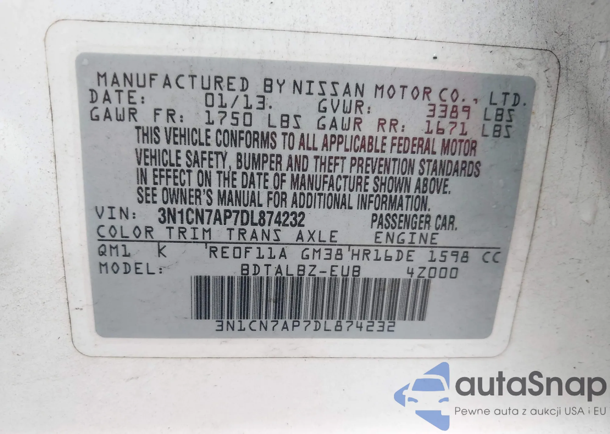 • VIN 3N1CN7AP7DL874232