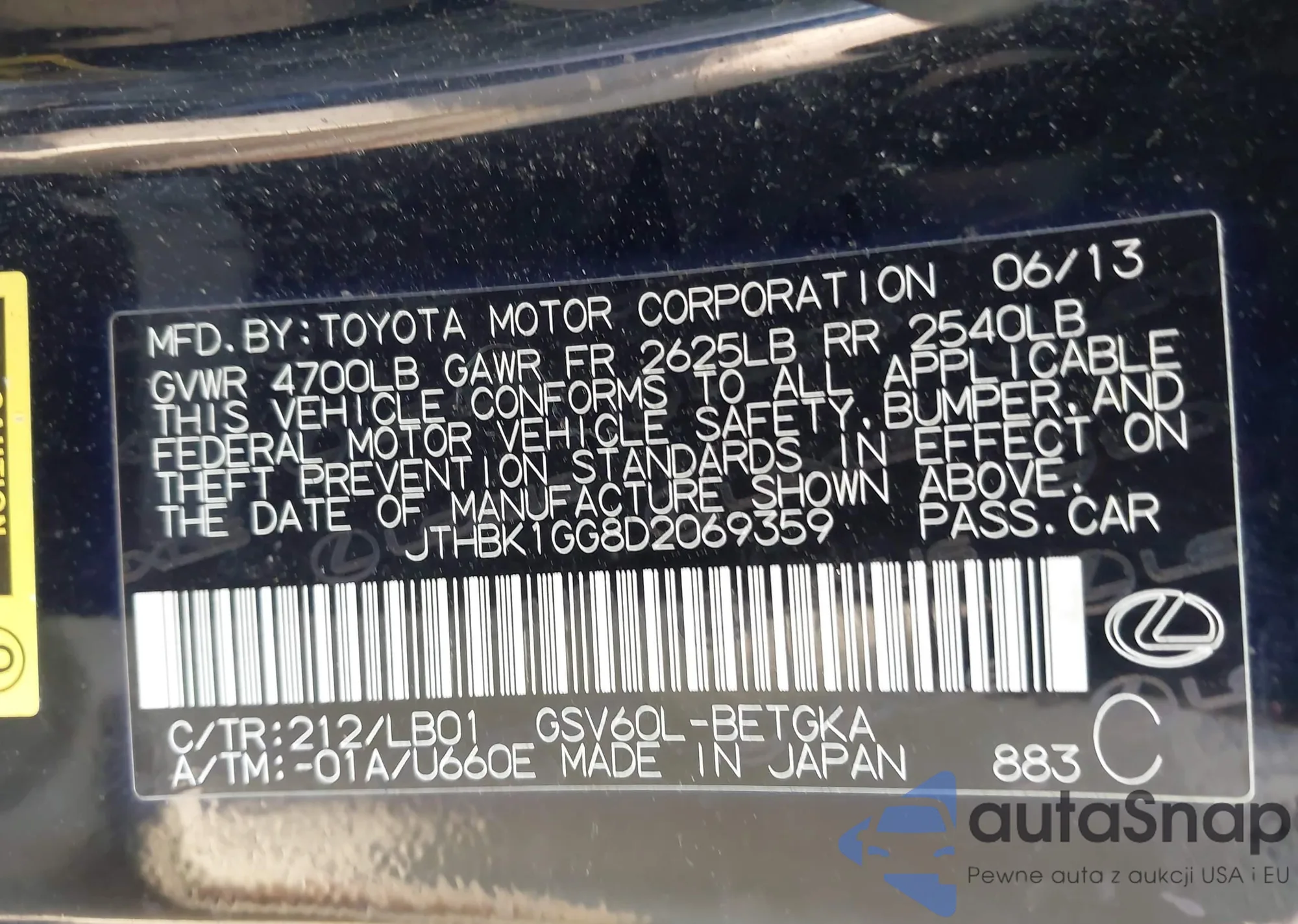 LOT: 43020372 VIN: JTHBK1GG8D2069359
