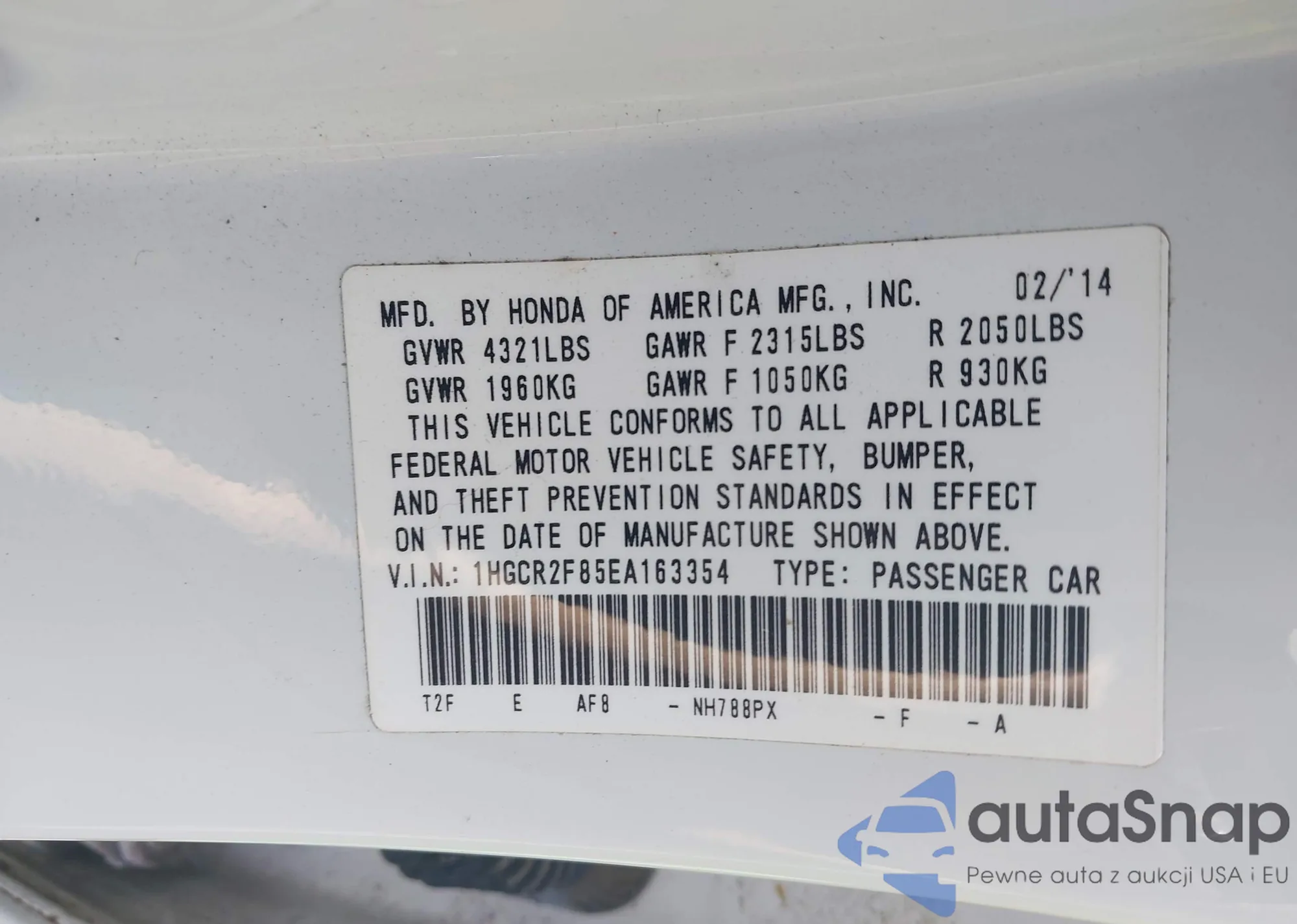 LOT: 42799662 VIN: 1HGCR2F85EA163354