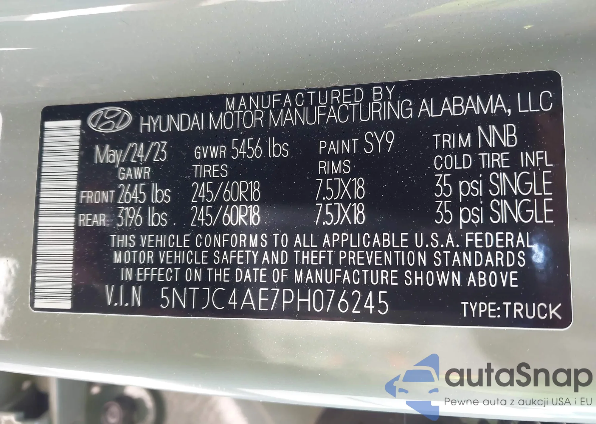 • VIN 5NTJC4AE7PH076245