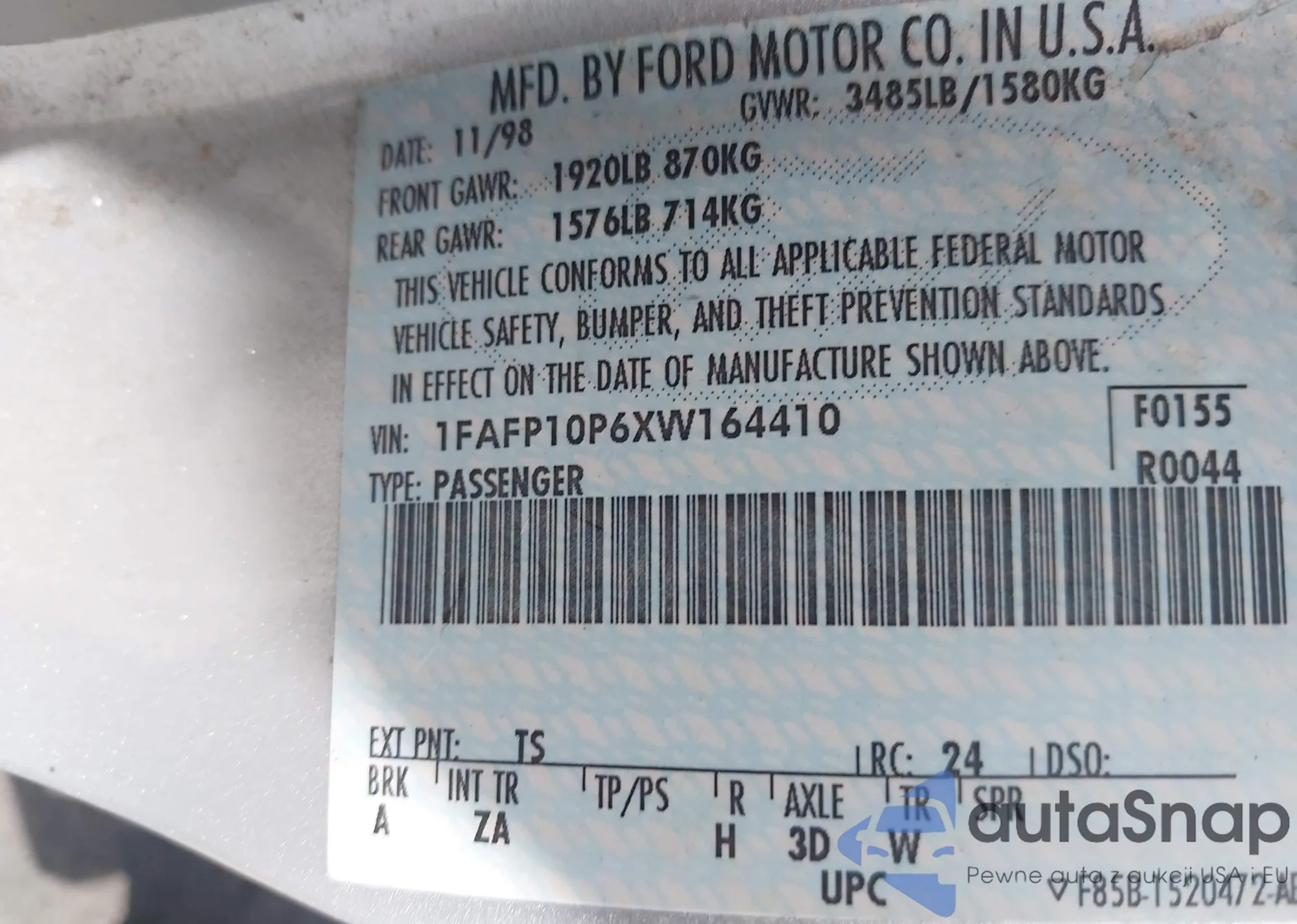 • VIN 1FAFP10P6XW164410