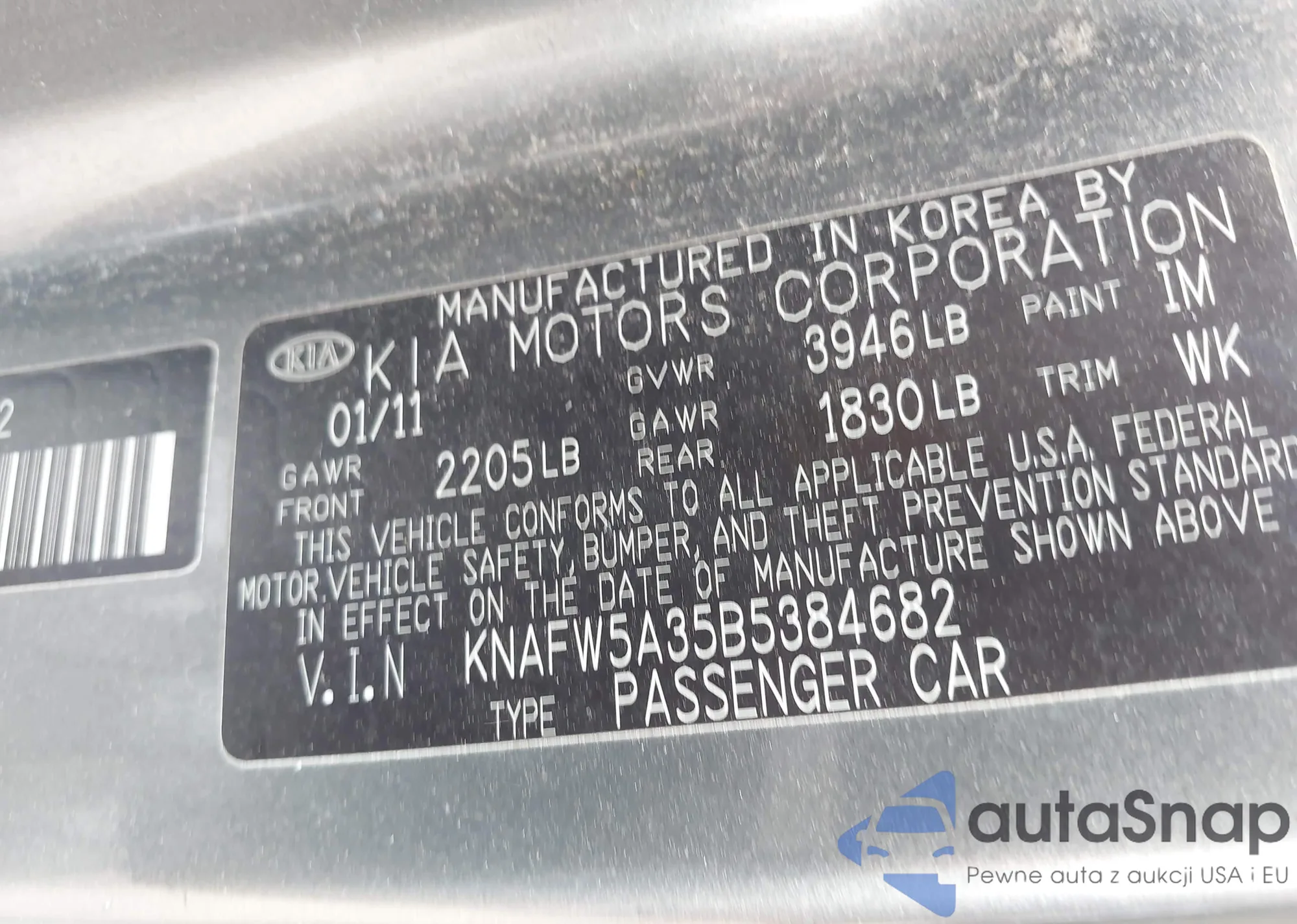 LOT: 42963685 VIN: KNAFW5A35B5384682