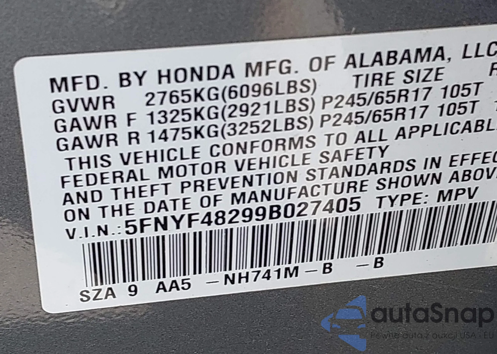 • VIN 5FNYF48299B027405