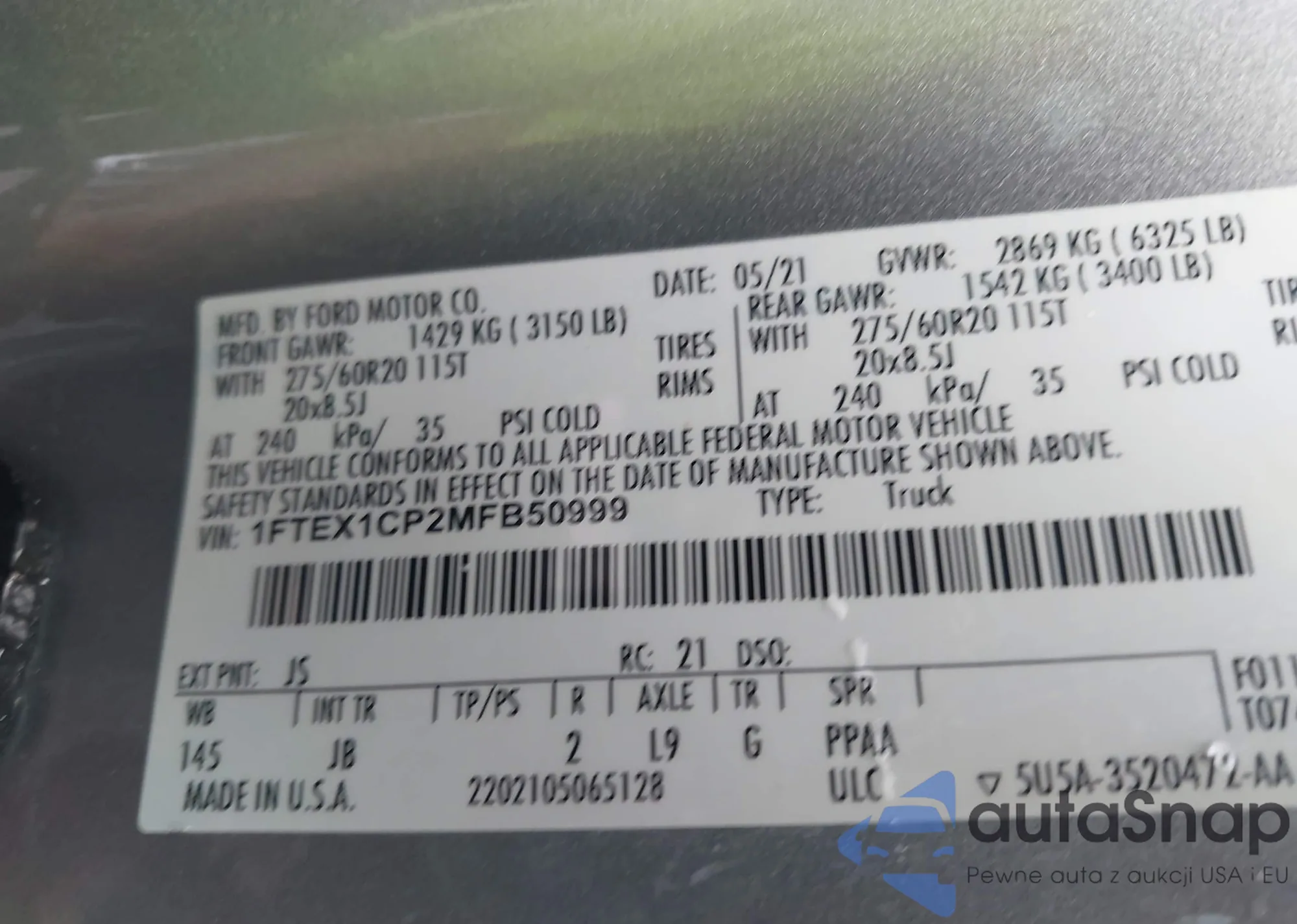 LOT: 42817189 VIN: 1FA6P8TH3M5105345