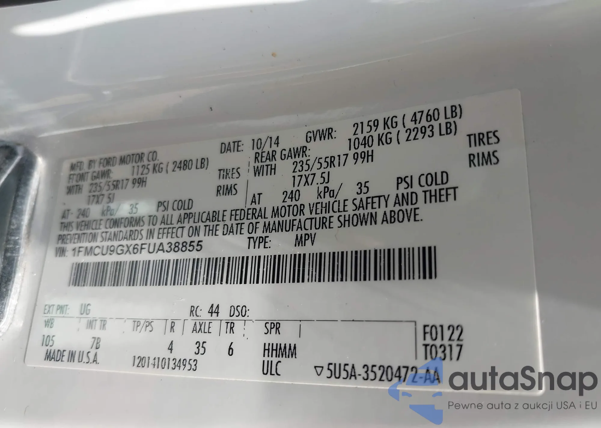 • VIN 1FMCU9GX6FUA38855