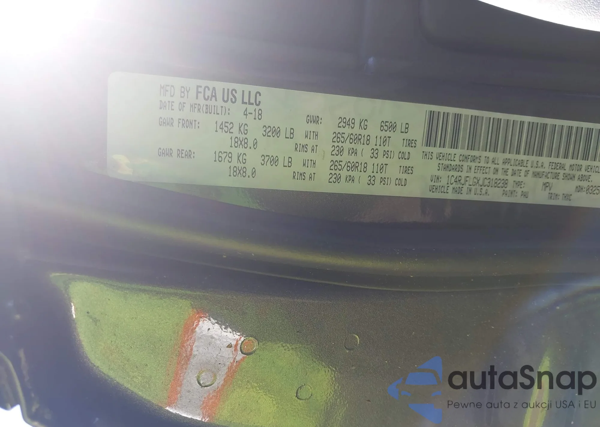 LOT: 42571477 VIN: 1C4RJFLGXJC318238