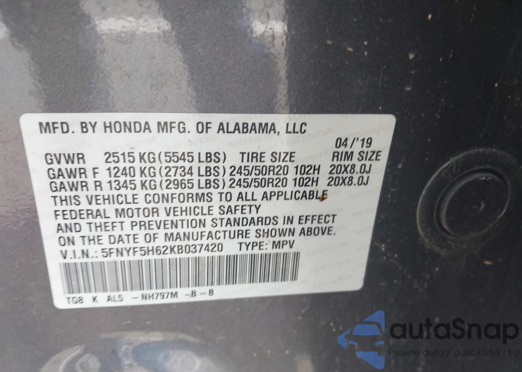 LOT: 43047587 VIN: 5FNYF5H62KB037420