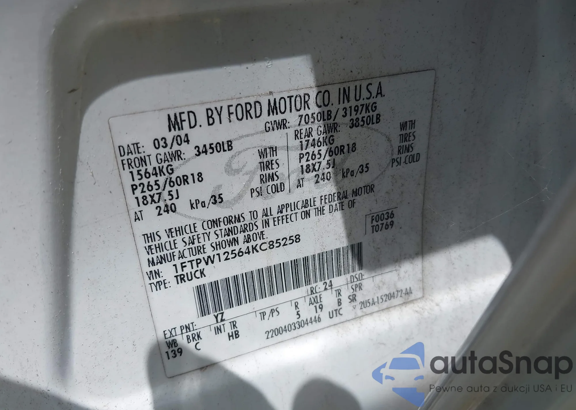 LOT: 42856971 VIN: 1FTPW12564KC85258