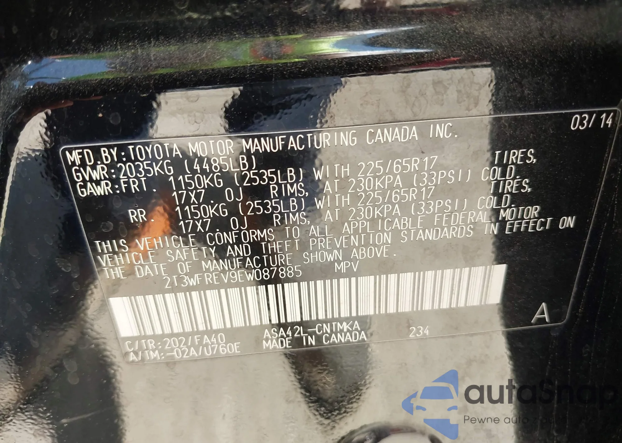 LOT: 43113921 VIN: 2T3WFREV9EW087885