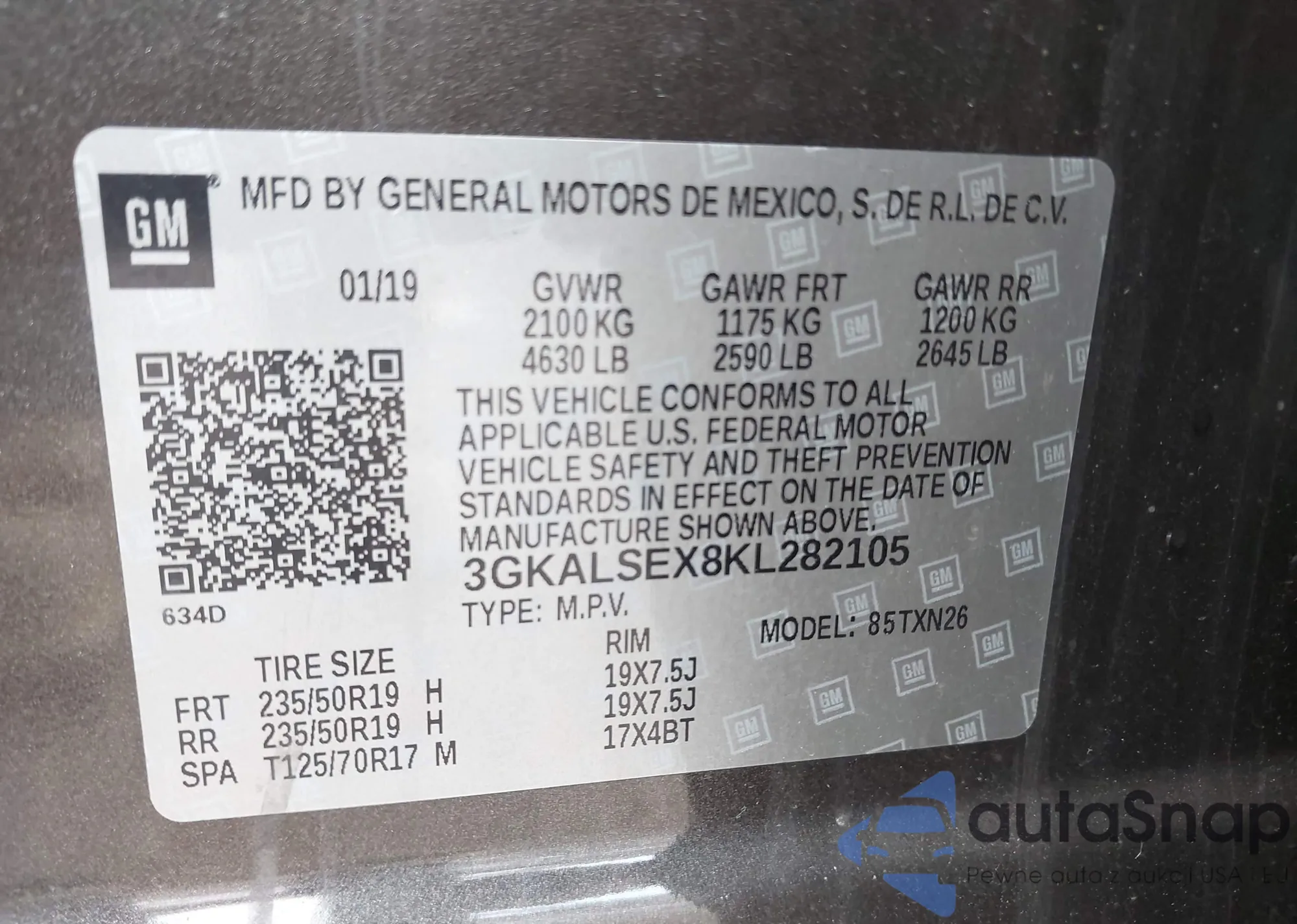 LOT: 43148800 VIN: 3GKALSEX8KL282105