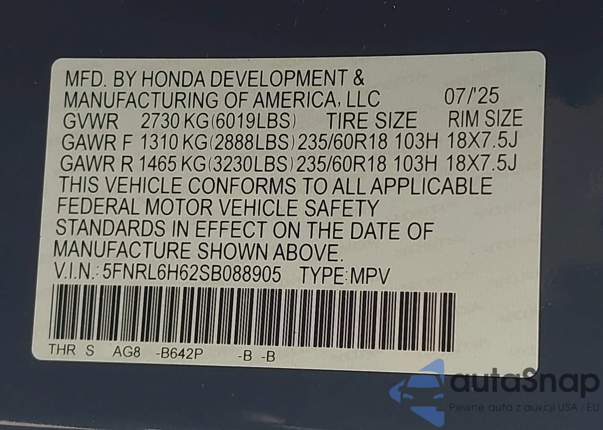 LOT: 43049581 VIN: 2HGFE2F55SH569260