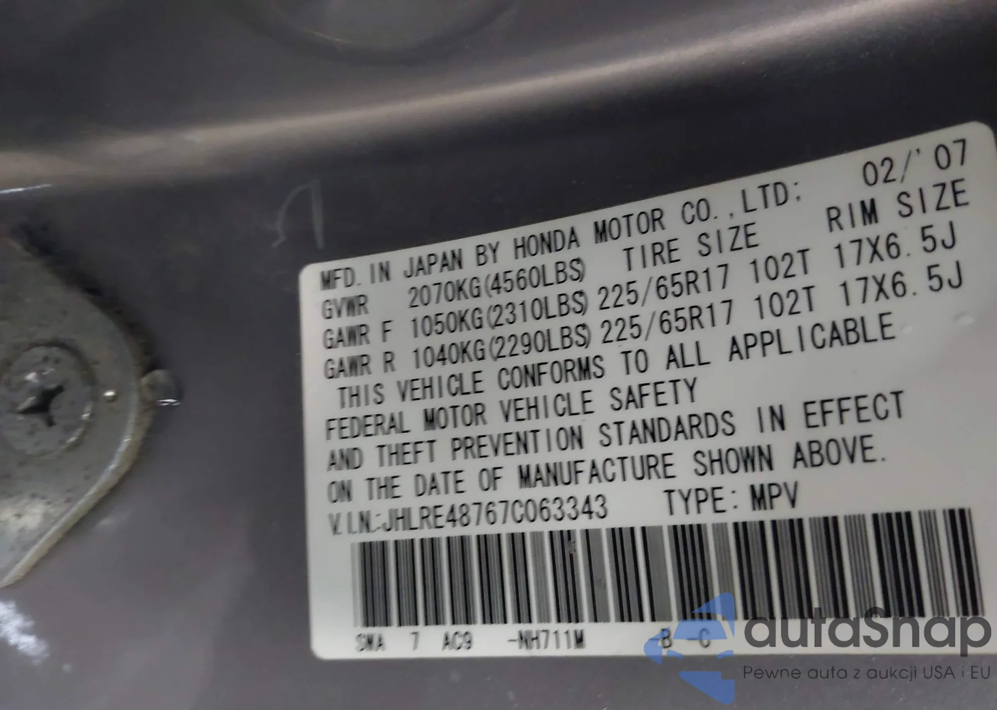 LOT: 43020165 VIN: 1HGCP2F34AA086206