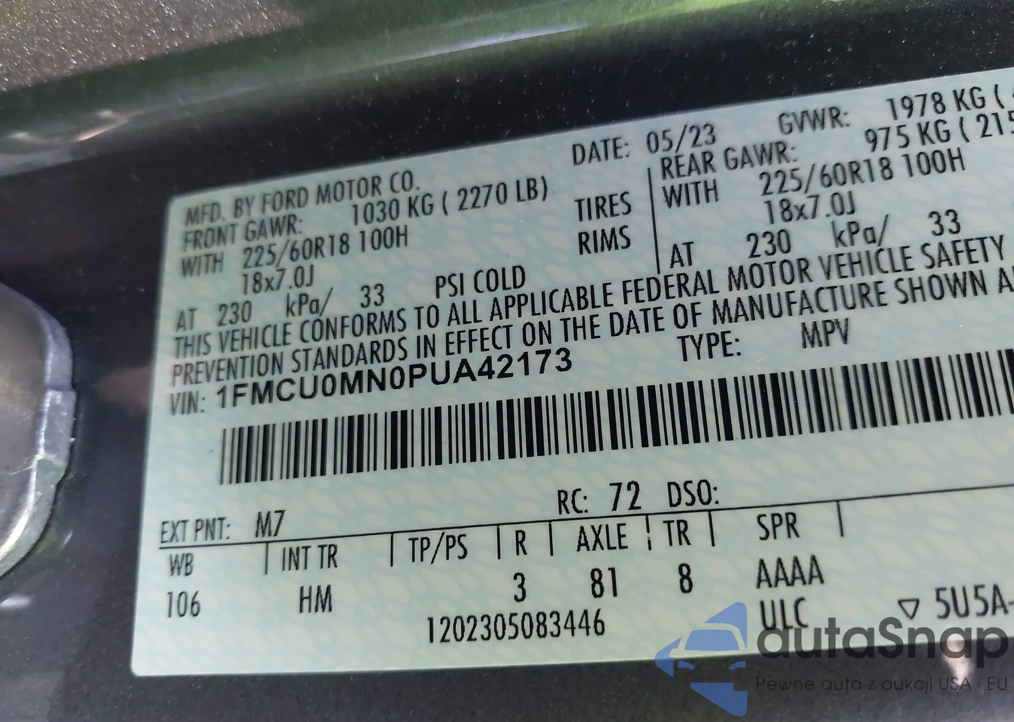• VIN 1FMCU0MN0PUA42173