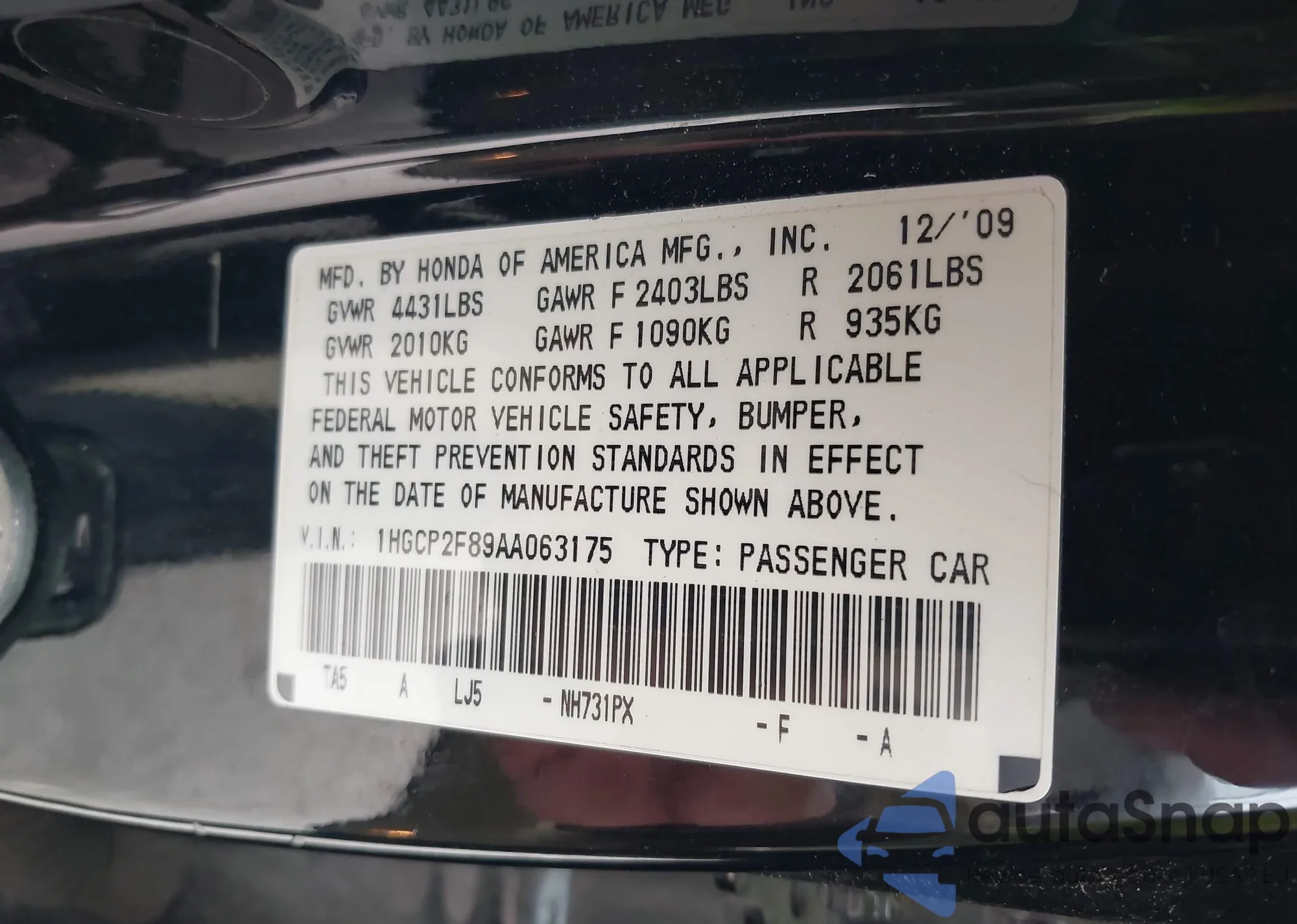LOT: 43059468 VIN: 1HGCP2F89AA063175