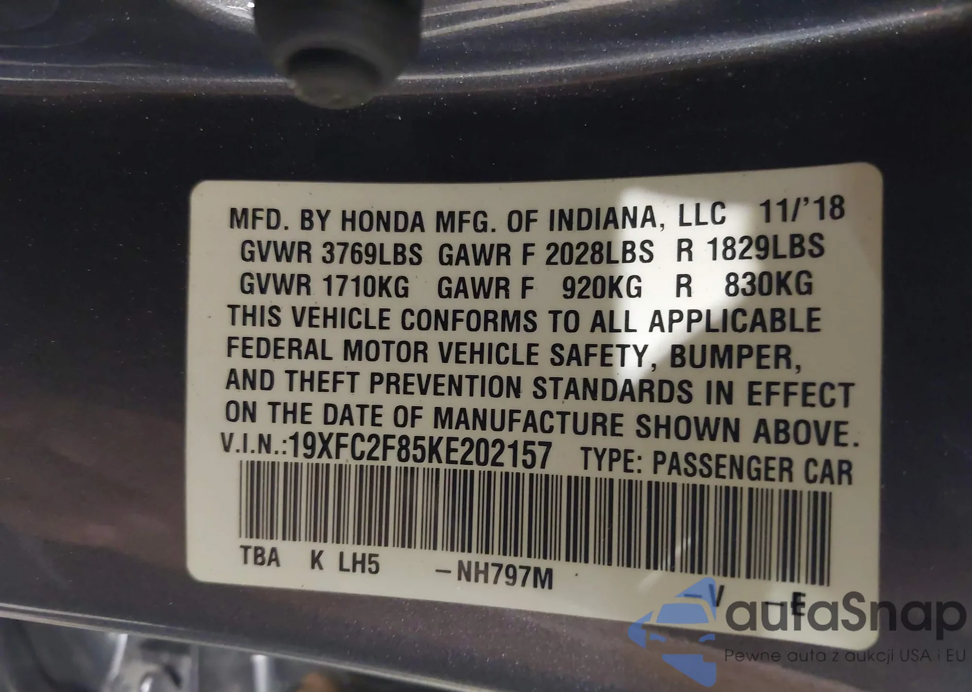 LOT: 42741864 VIN: 19XFC2F65KE048015