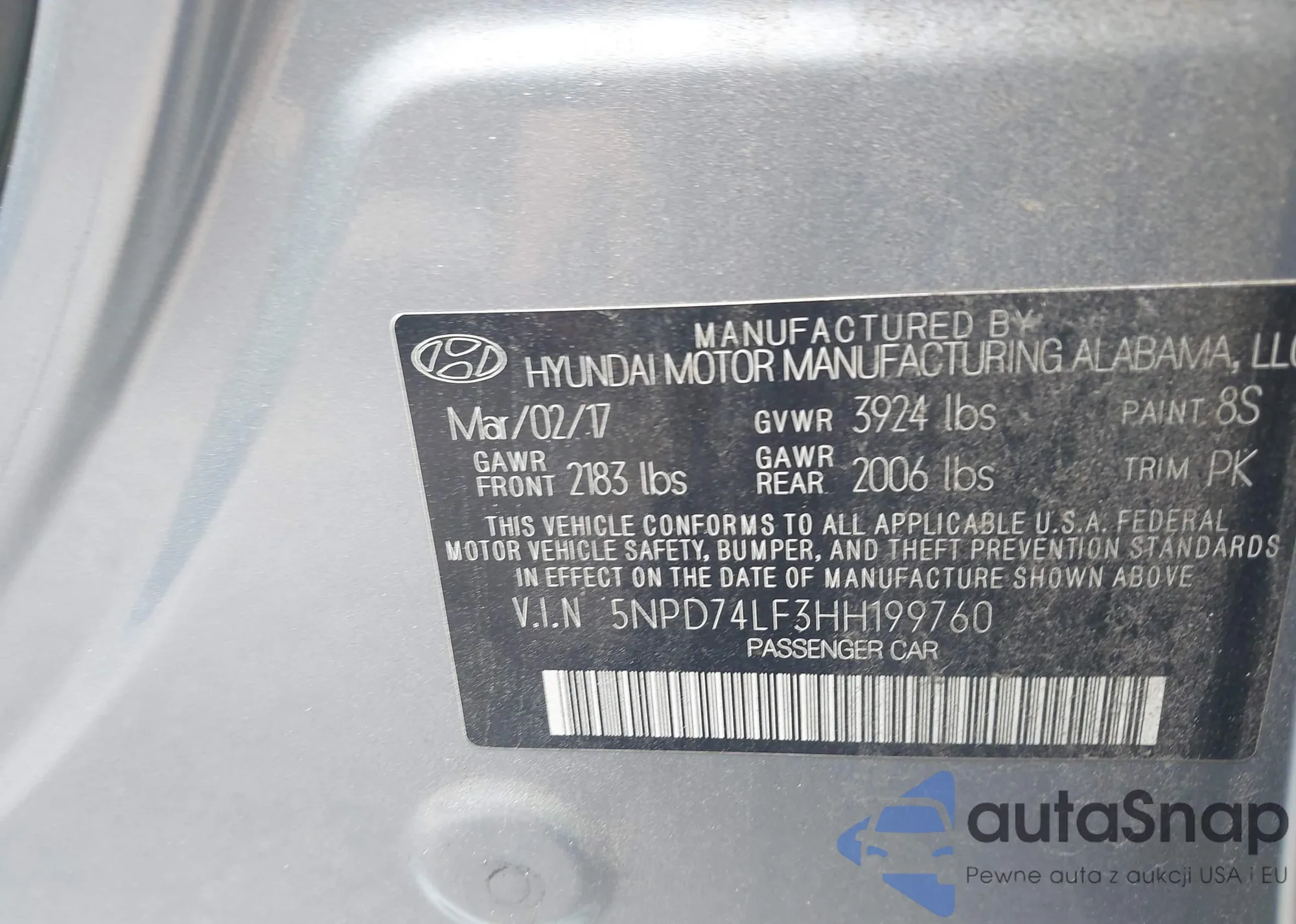 • VIN 5NPE24AA3FH163526