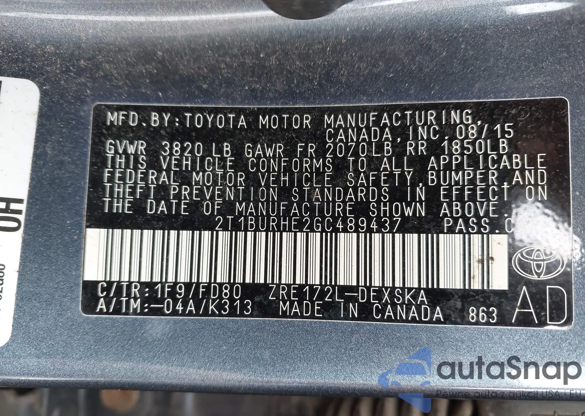 LOT: 42816204 VIN: 2T1BURHE2GC489437