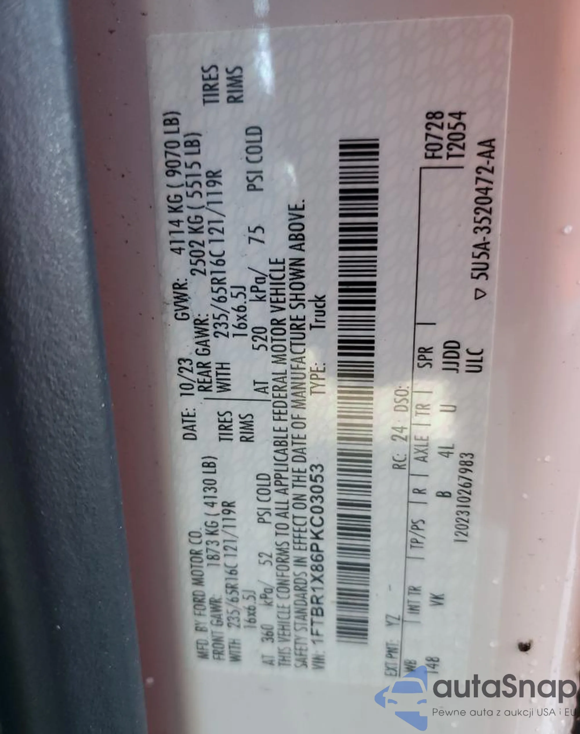 LOT: 68247515 VIN: 1FTBR1X86PKC03053