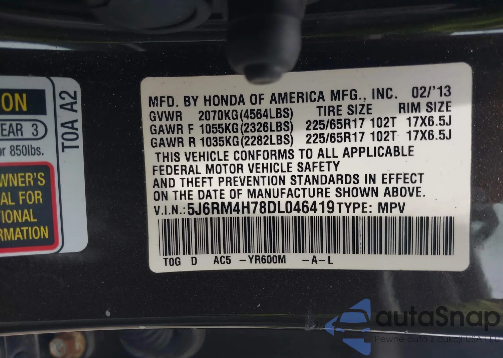 • VIN 5J6RM4H78DL046419